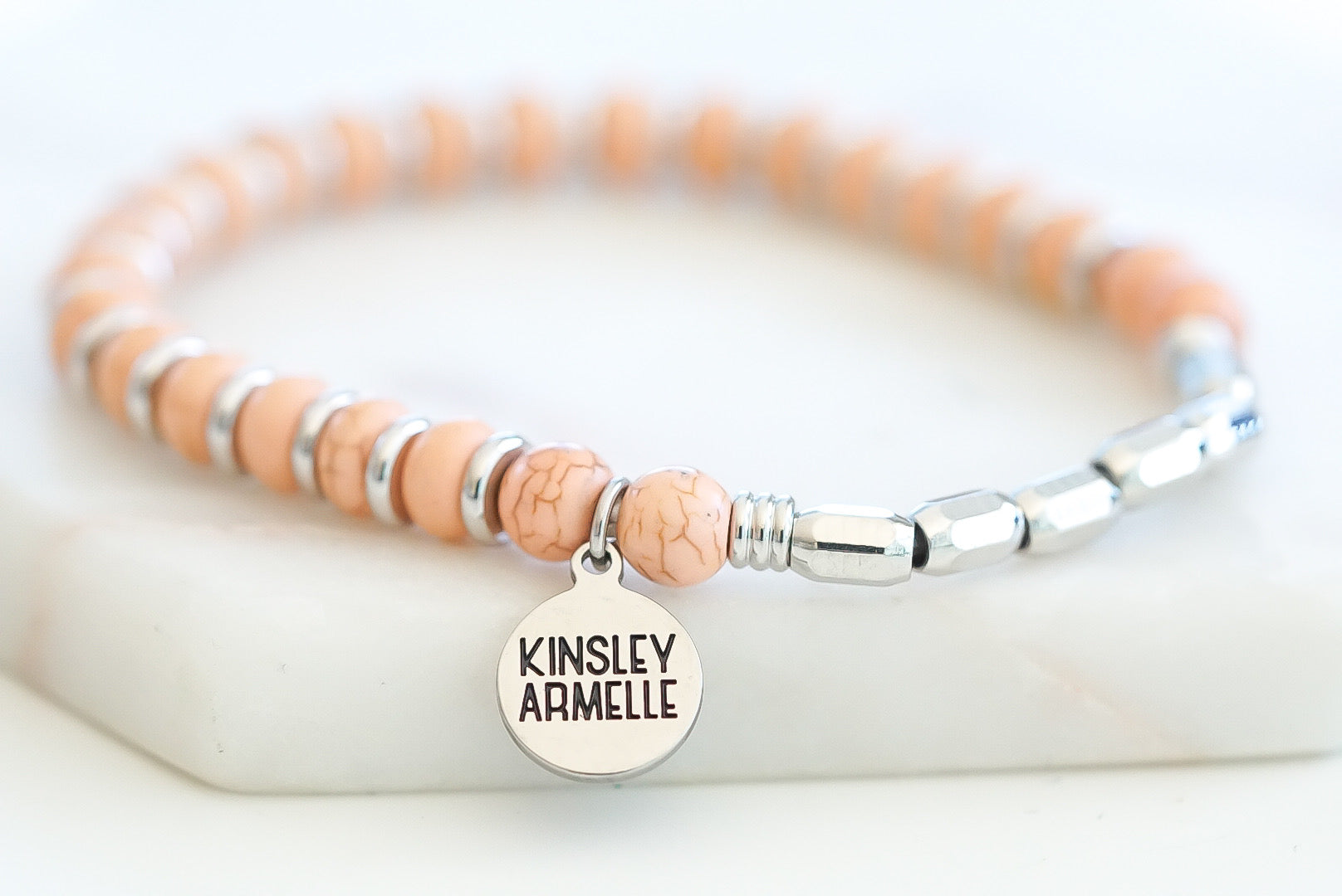Silver And Orange Cylindrical Disc Faceted Geometric Hypoallergenic Nickel Free Beaded Stretch Bracelet. Custom Decorative Accent Beads Accents And Designed With Love In Texas. Size Small, Medium, Large, and Extra Large Ranging From 6.25 - 7.25 Inch Circumference With Custom Sizing Available On Select Pieces.