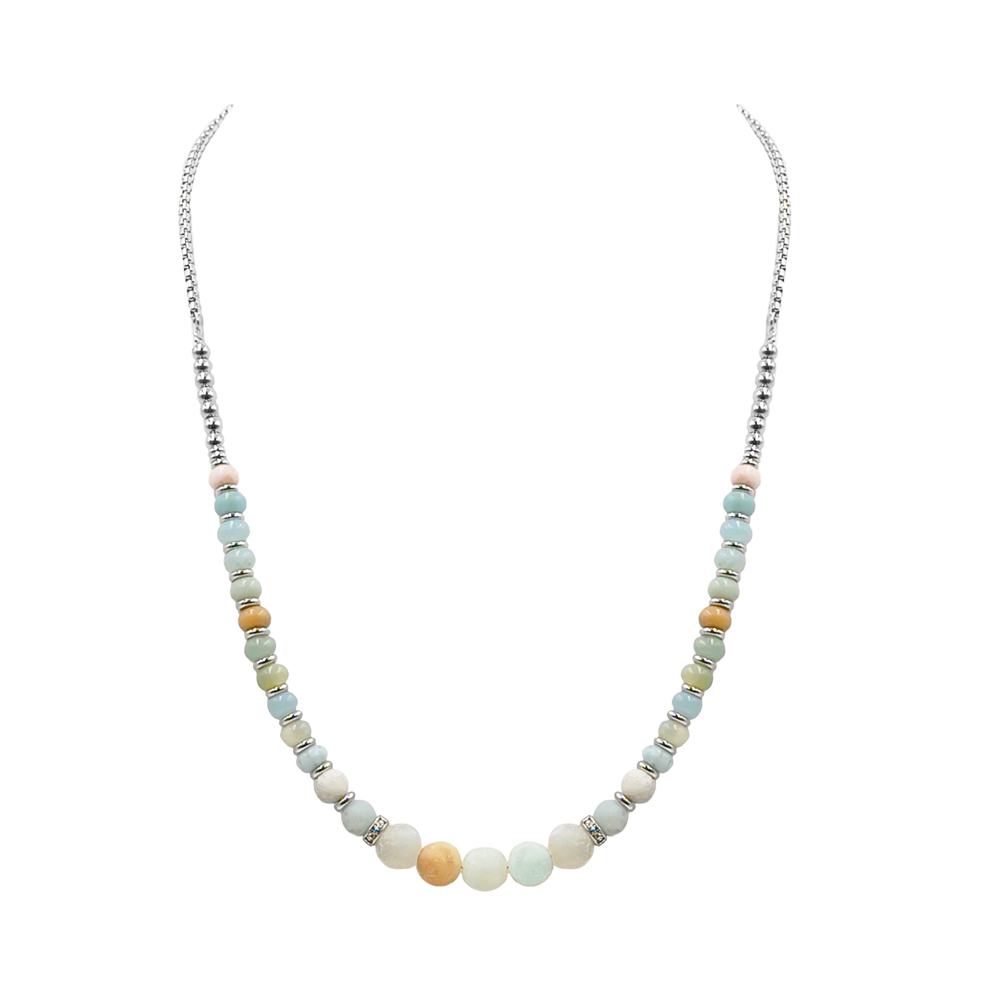 Silver And Light Blue Cylindrical Disc Geometric Green Mint Multicolored Natural Stone Hypoallergenic Nickel Free Beaded Necklace. Custom Amazonite Raw Natural Stone Accents And Designed With Love In Texas. Size 18 or 22 Inch Length, Plus 3 Inch Attached Necklace Extender With Custom Sizing Available On Select Pieces.