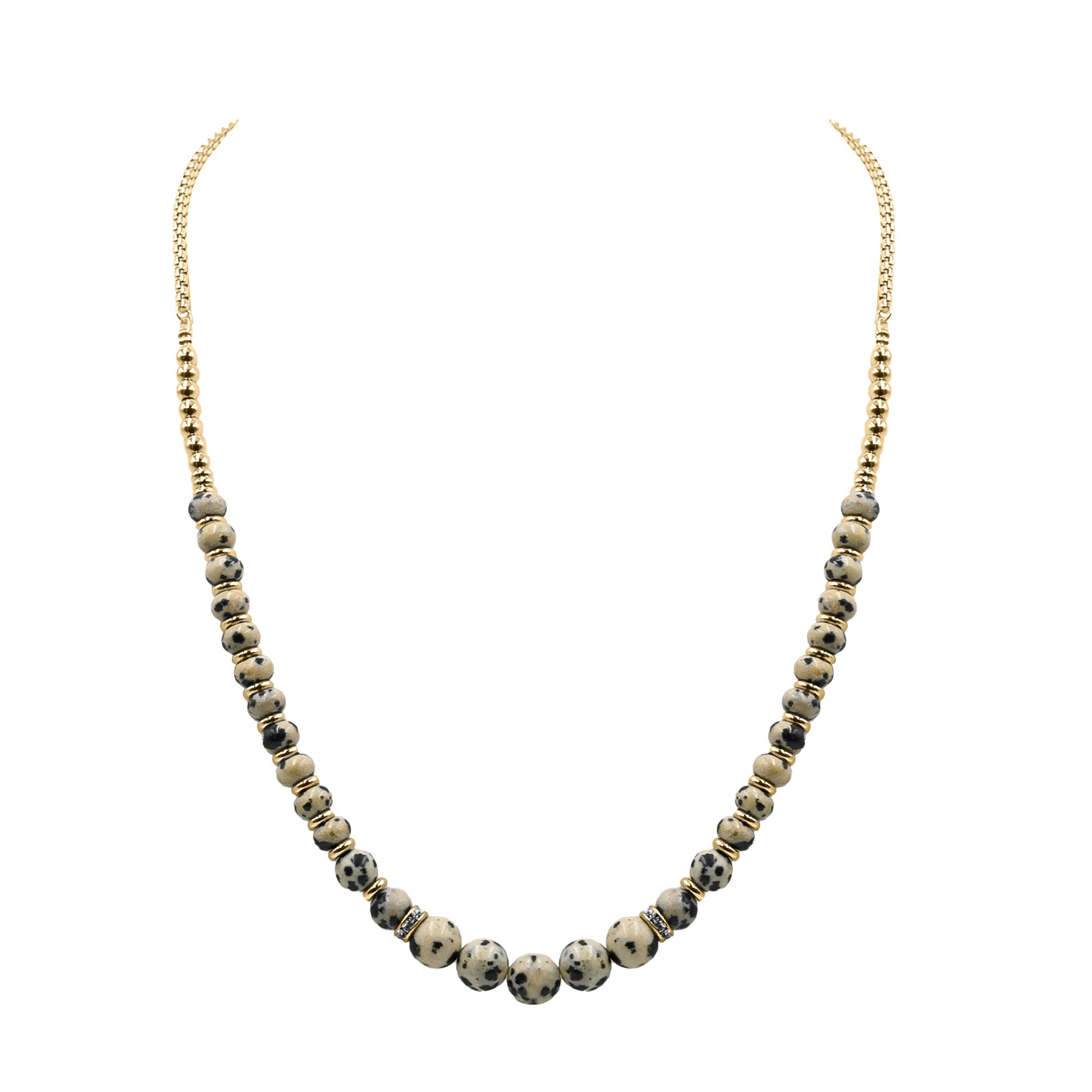 Gold And Brown Cheetah Cylindrical Disc Geometric Leopard Natural Stone Hypoallergenic Nickel Free Beaded Necklace. Custom Dalmatian Jasper Raw Natural Stone Accents And Designed With Love In Texas. Size 18 or 22 Inch Length, Plus 3 Inch Attached Necklace Extender With Custom Sizing Available On Select Pieces.