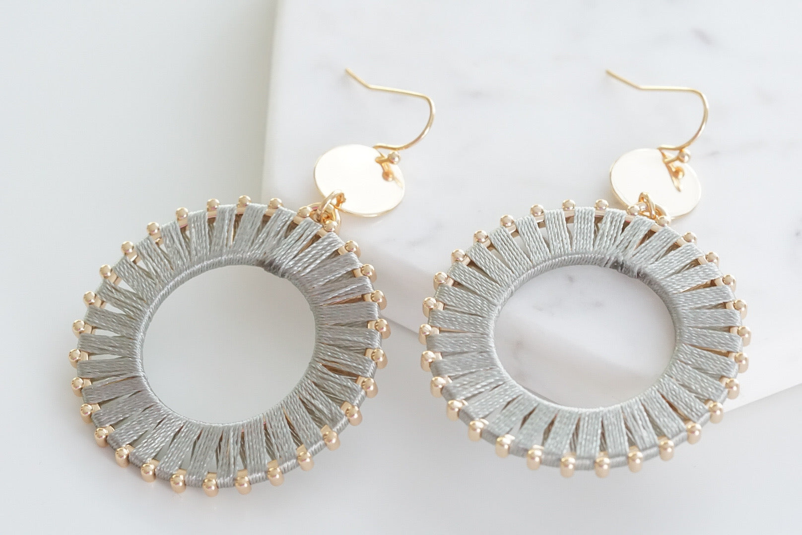 Gold And Gray Boho Disc Studded Thread String Lightweight Hypoallergenic Nickel Free Statement Drop Earrings. Custom Linen Thread Accents And Designed With Love In Texas. Size 2.5 Inches Length x 1.5 Inches Width With Custom Sizing Available On Select Pieces.