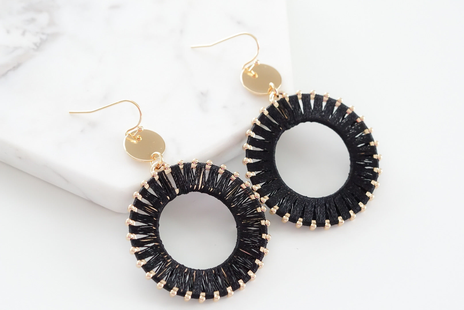 Gold And Black Boho Disc Studded Thread String Lightweight Hypoallergenic Nickel Free Statement Drop Earrings. Custom Linen Thread Accents And Designed With Love In Texas. Size 2.5 Inches Length x 1.5 Inches Width With Custom Sizing Available On Select Pieces.