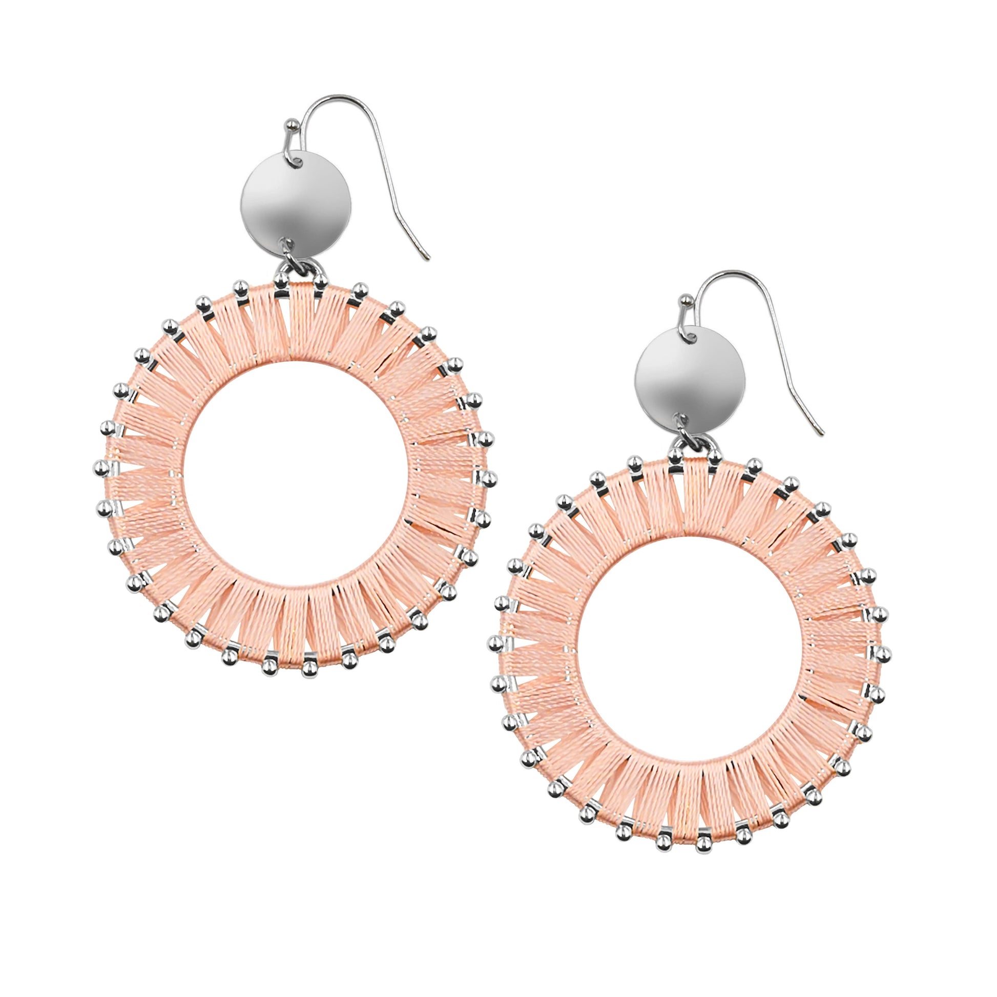 Silver And Pink Boho Disc Peach Studded Thread String Lightweight Hypoallergenic Nickel Free Statement Drop Earrings. Custom Linen Thread Accents And Designed With Love In Texas. Size 2.5 Inches Length x 1.5 Inches Width With Custom Sizing Available On Select Pieces.