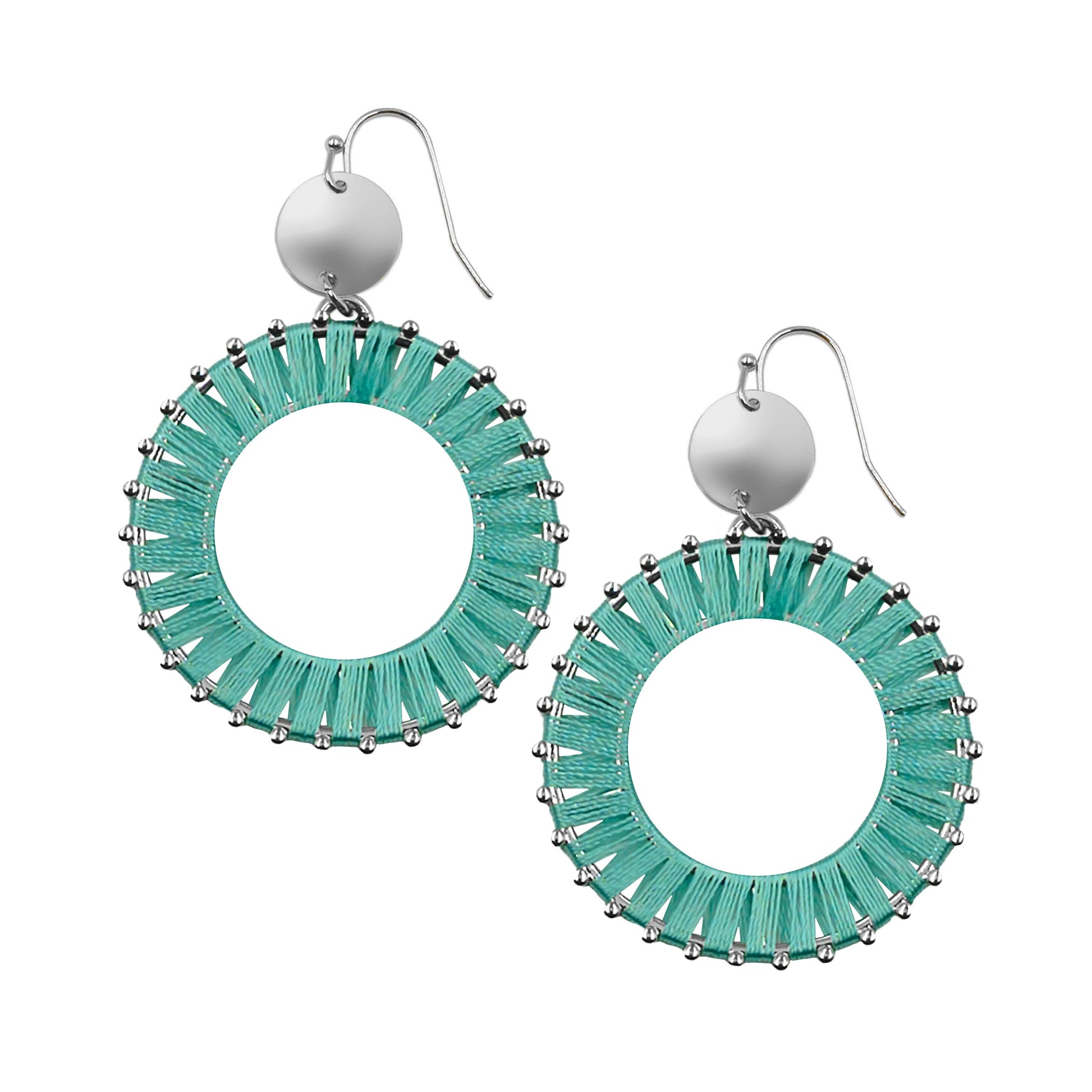Silver And Light Blue Boho Disc Studded Thread String Lightweight Hypoallergenic Nickel Free Statement Drop Earrings. Custom Linen Thread Accents And Designed With Love In Texas. Size 2.5 Inches Length x 1.5 Inches Width With Custom Sizing Available On Select Pieces.
