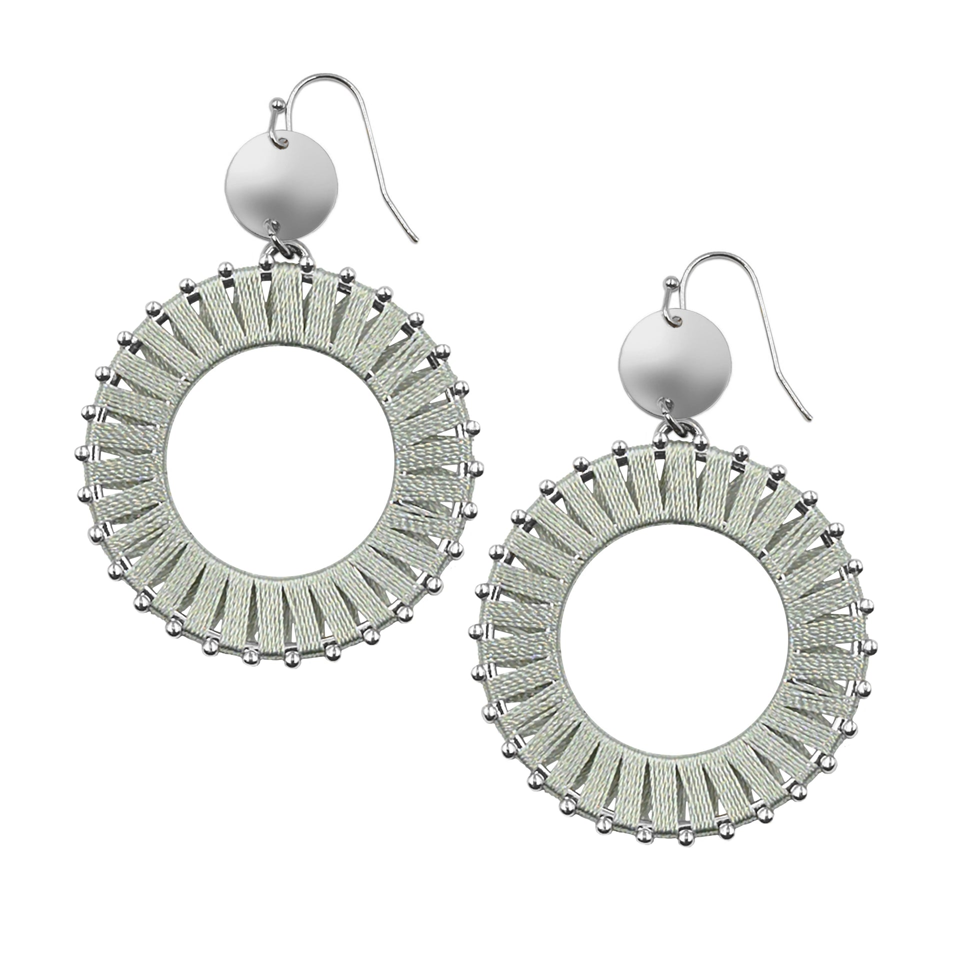 Silver And Gray Boho Disc Studded Thread String Lightweight Hypoallergenic Nickel Free Statement Drop Earrings. Custom Linen Thread Accents And Designed With Love In Texas. Size 2.5 Inches Length x 1.5 Inches Width With Custom Sizing Available On Select Pieces.