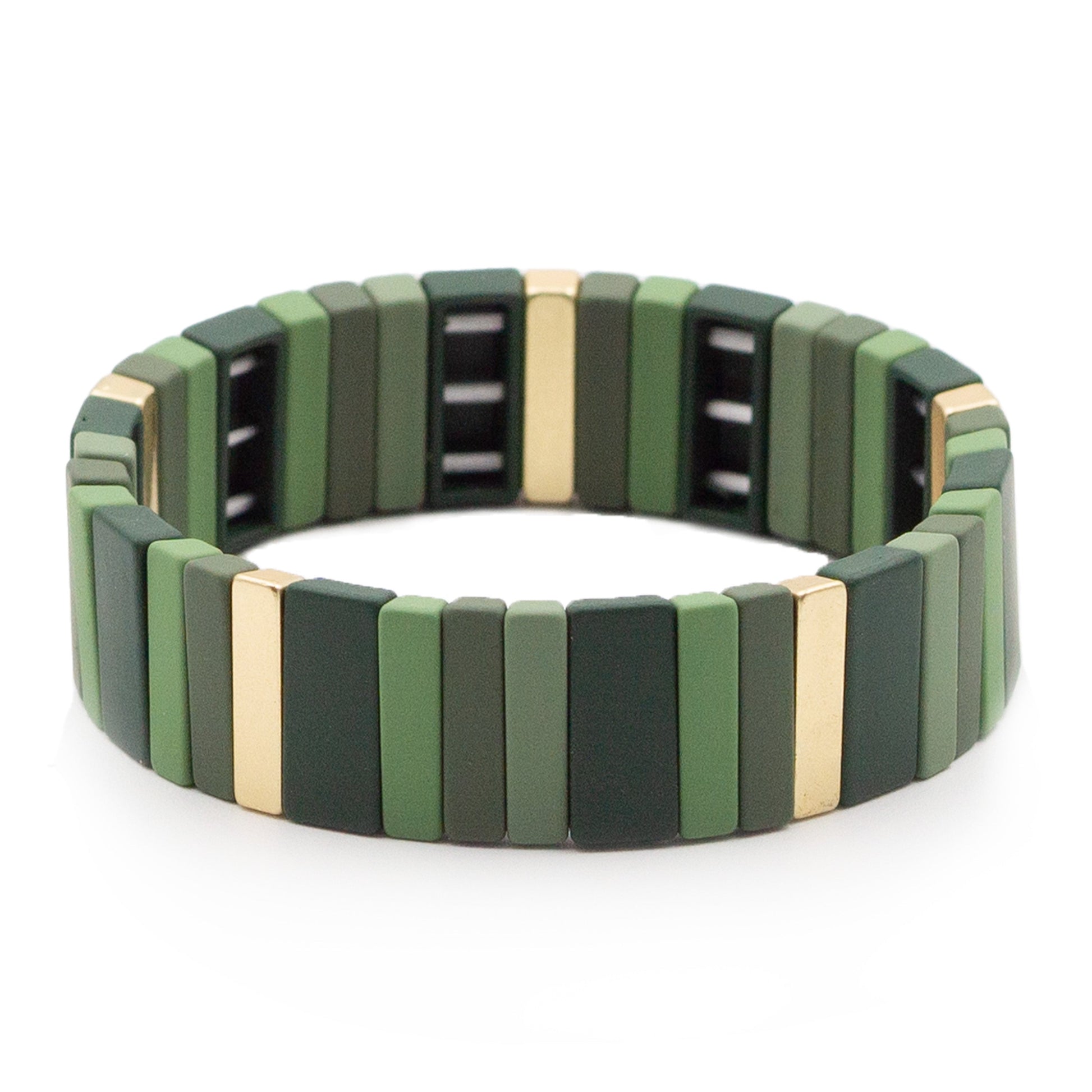 Gold And Green Aztec Statement Beaded Stretch Bracelet. Custom Decorative Accent Beads Accents And Designed With Love In Texas. Size Small, Medium, Large, and Extra Large Ranging From 6.25 - 7.25 Inch Circumference With Custom Sizing Available On Select Pieces.