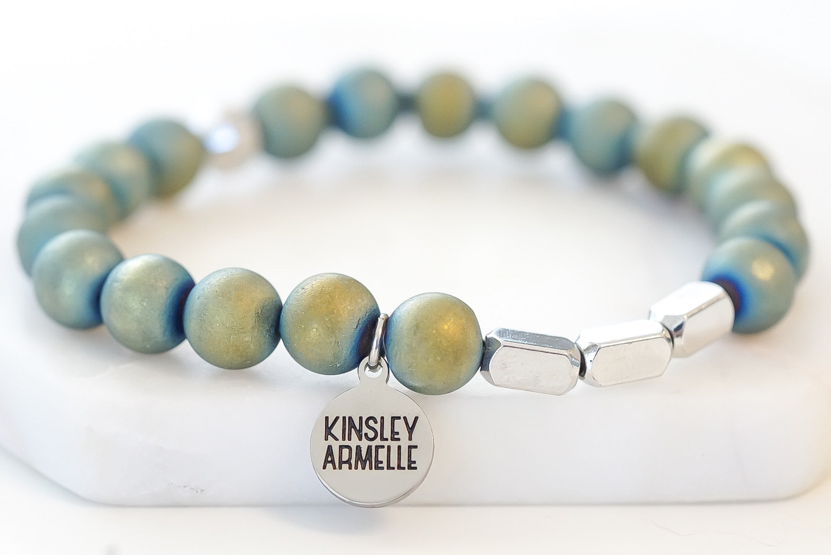 Silver And Green Cubed Faceted Geode Pocks Natural Stone Hypoallergenic Nickel Free Beaded Stretch Bracelet. Custom Decorative Accent Beads Accents And Designed With Love In Texas. Size Small, Medium, Large, and Extra Large Ranging From 6.25 - 7.25 Inch Circumference With Custom Sizing Available On Select Pieces.
