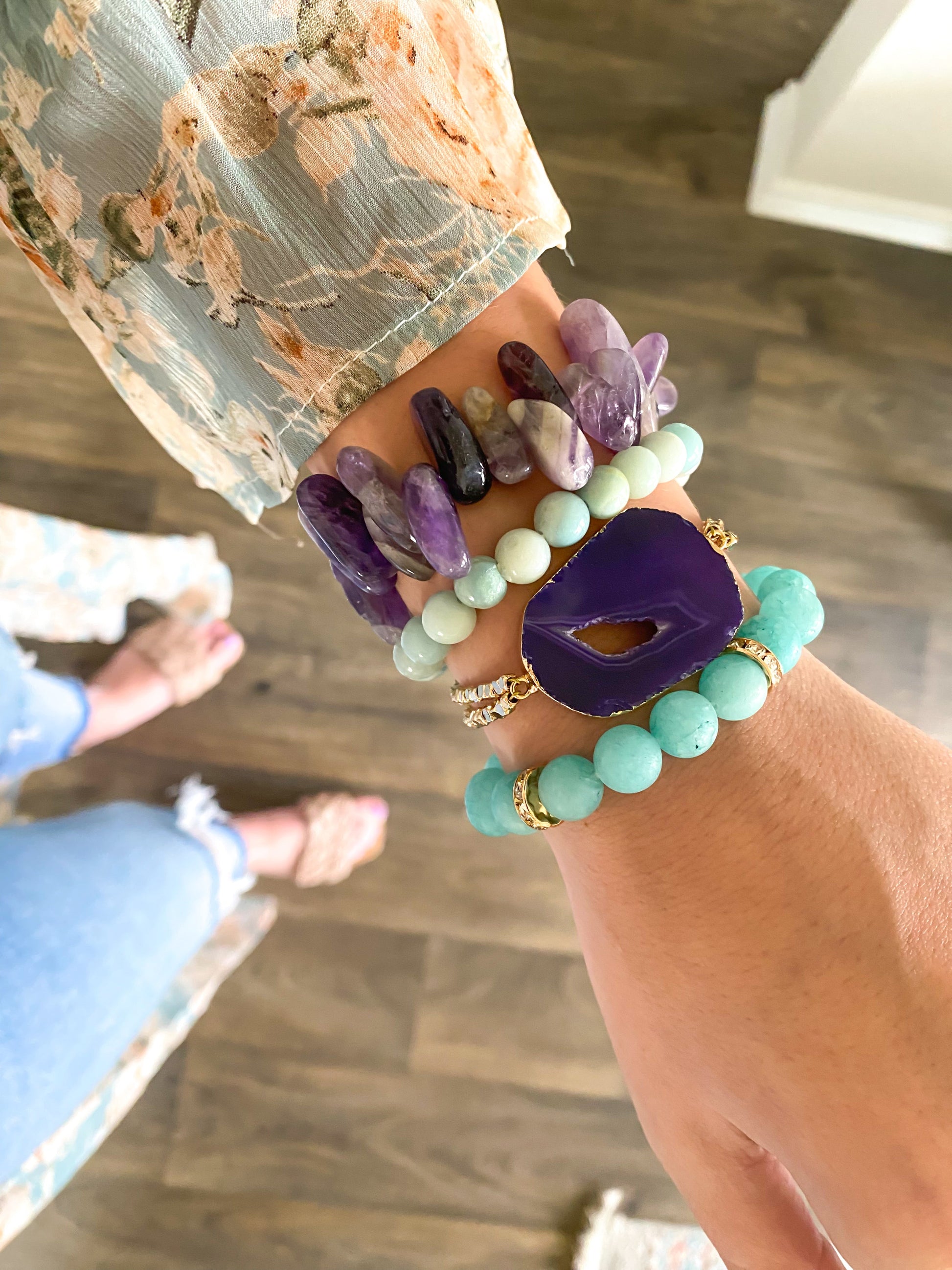 Gold And Purple Adjustable Beads Chip Chunky Natural Stone Stackable Hypoallergenic Nickel Free Bracelet Stack Set. Custom Agate Slices Raw Natural Stone Accents And Designed With Love In Texas. Size Small, Medium, Large, and Extra Large Ranging From 6.25 - 7.25 Inch Circumference With Custom Sizing Available On Select Pieces.