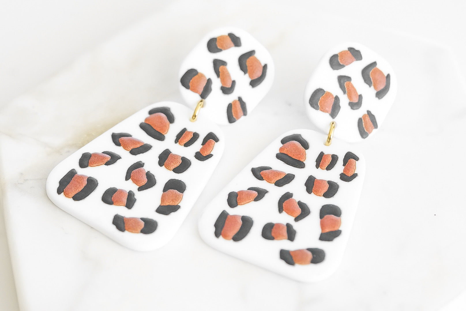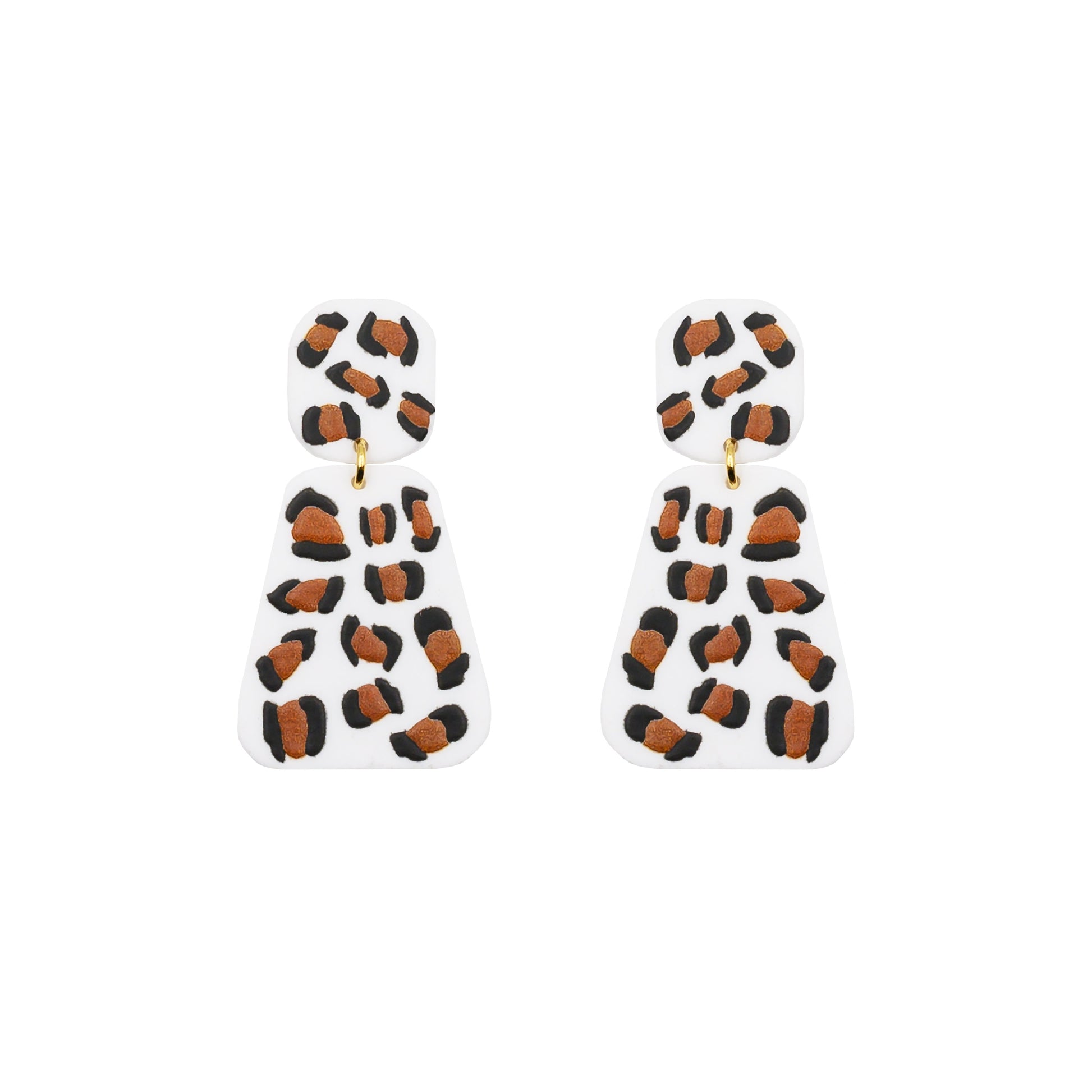 Gold And Brown Cheetah Leopard Stud Tiered Featherweight Hypoallergenic Nickel Free Drop Earrings. Custom Lucite Acrylic Geometric Shapes Accents And Designed With Love In Texas. Size 2 Inches Length x 1 Inch Width With Custom Sizing Available On Select Pieces.