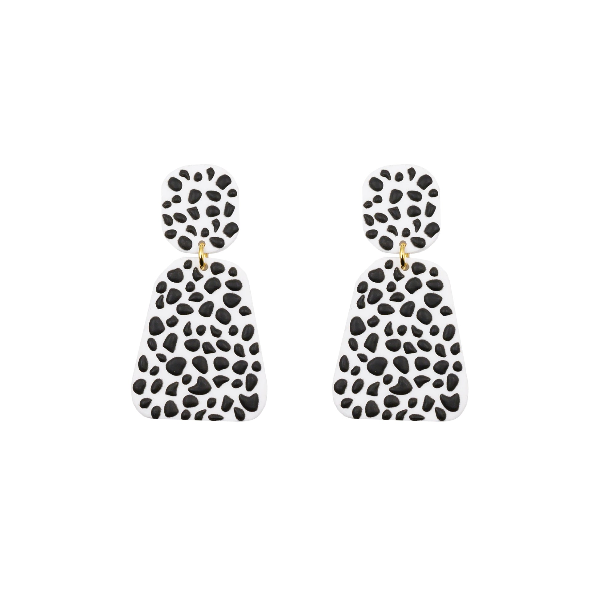Gold And White Dalmatian Dotted Stud Tiered Featherweight Hypoallergenic Nickel Free Drop Earrings. Custom Lucite Acrylic Geometric Shapes Accents And Designed With Love In Texas. Size 2 Inches Length x 1 Inch Width With Custom Sizing Available On Select Pieces.