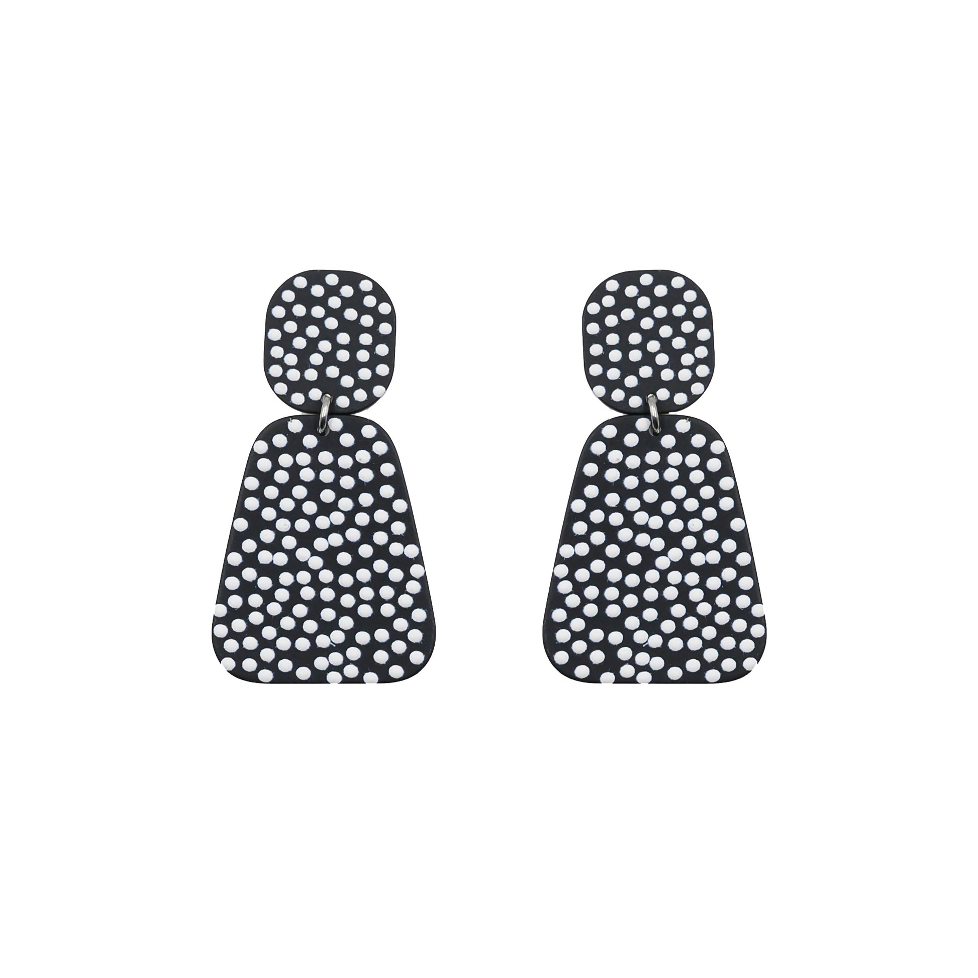 Silver And Black Dotted Polka Dot Stud Tiered Featherweight Hypoallergenic Nickel Free Drop Earrings. Custom Lucite Acrylic Geometric Shapes Accents And Designed With Love In Texas. Size 2 Inches Length x 1 Inch Width With Custom Sizing Available On Select Pieces.
