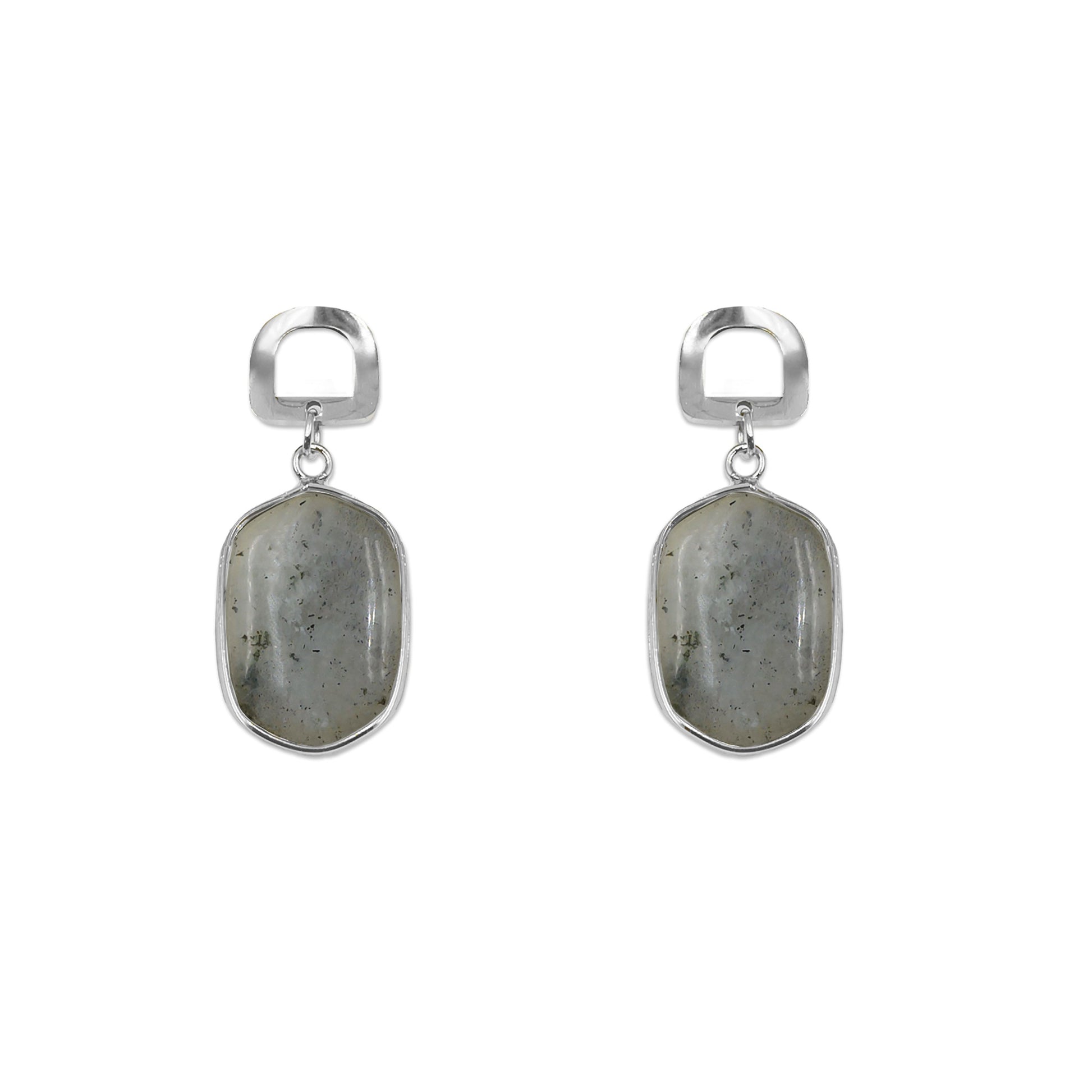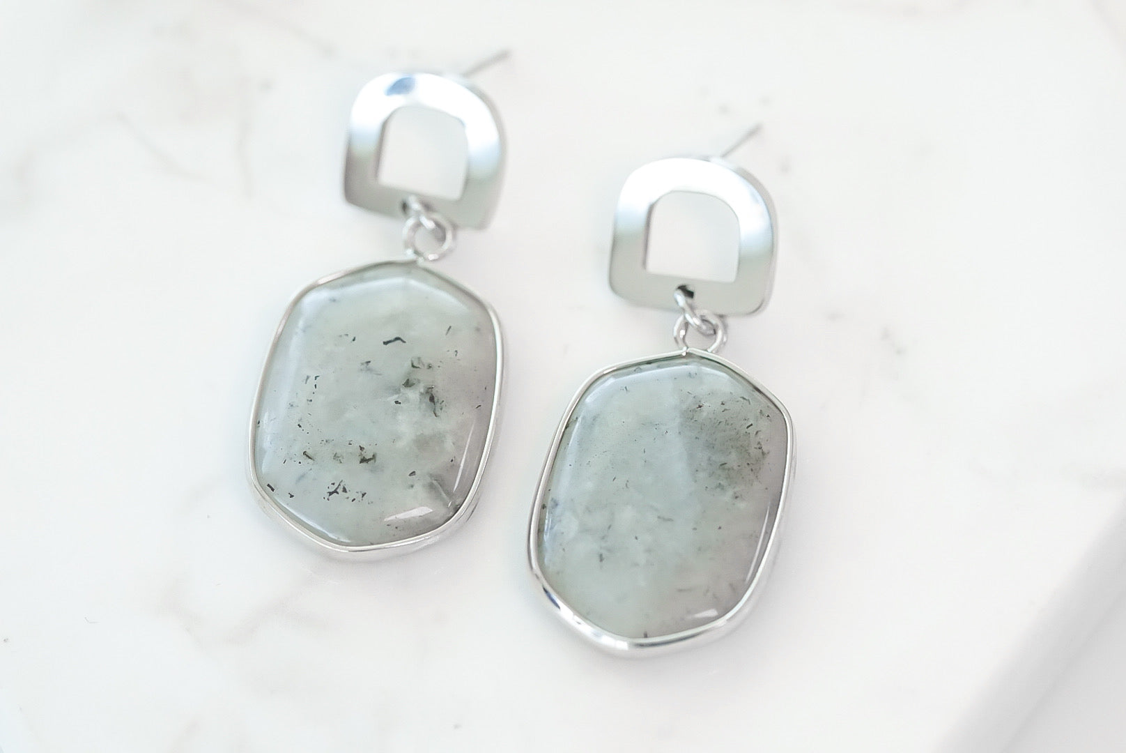 Silver And Green Cylindrical Natural Stone Stud Tiered Lightweight Hypoallergenic Nickel Free Drop Earrings. Custom Labradorite Raw Natural Stone Accents And Designed With Love In Texas. Size 1.75 Inches Length x 0.75 Inches Width With Custom Sizing Available On Select Pieces.