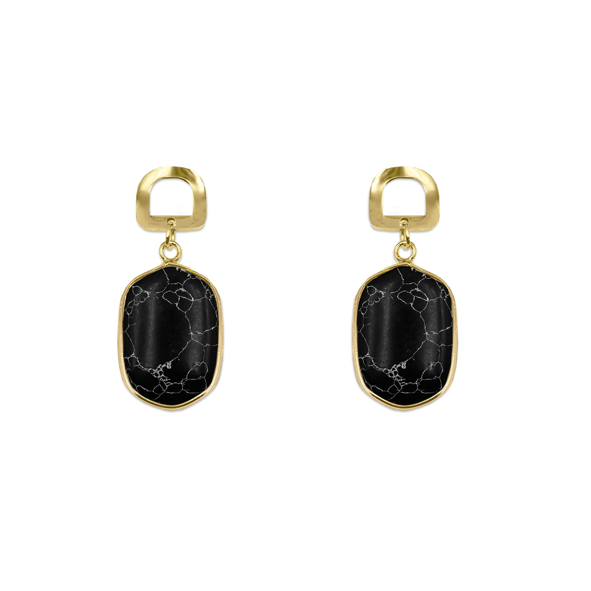 Gold And Black Cylindrical Marble Natural Stone Stud Tiered Lightweight Hypoallergenic Nickel Free Drop Earrings. Custom Marquina Raw Natural Stone Accents And Designed With Love In Texas. Size 1.75 Inches Length x 0.75 Inches Width With Custom Sizing Available On Select Pieces.