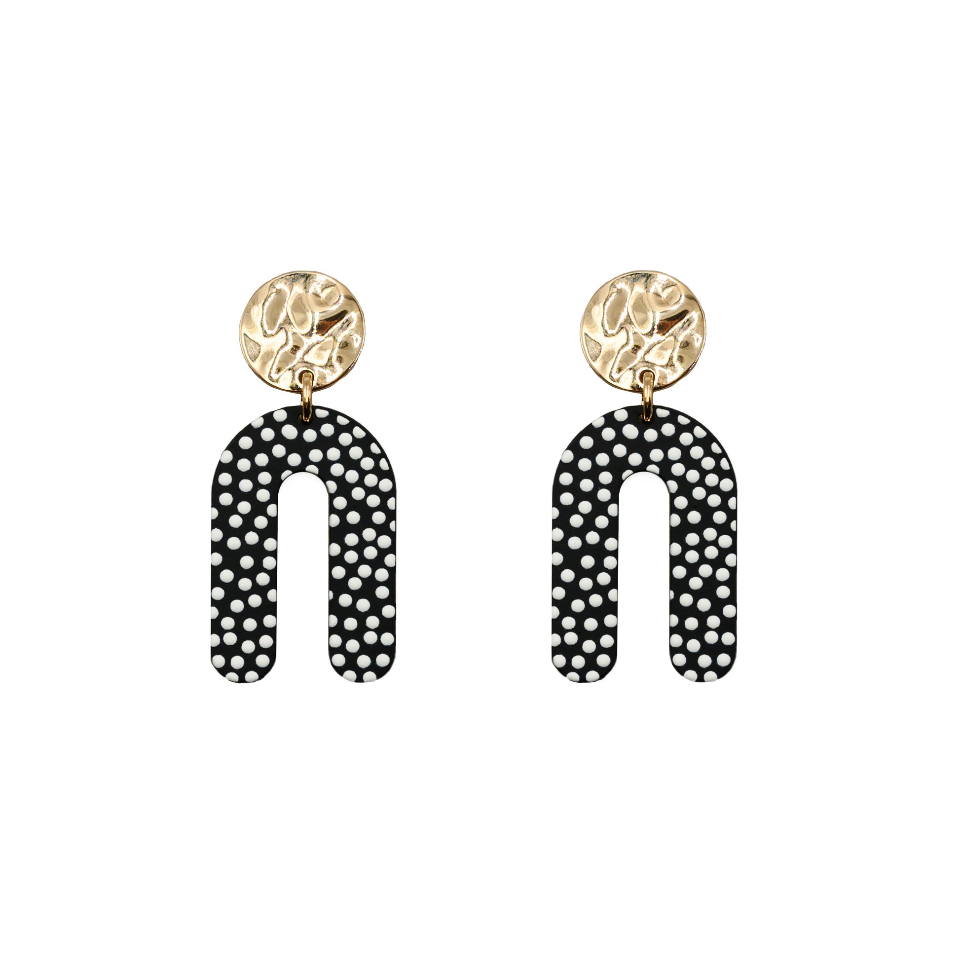 Gold And Black Arch Disc Dotted Hammered Polka Dot Stud Featherweight Hypoallergenic Nickel Free Drop Earrings. Custom Lucite Acrylic Geometric Shapes Accents And Designed With Love In Texas. Size 1.75 Inches Long x .75 Inches Wide With Custom Sizing Available On Select Pieces.