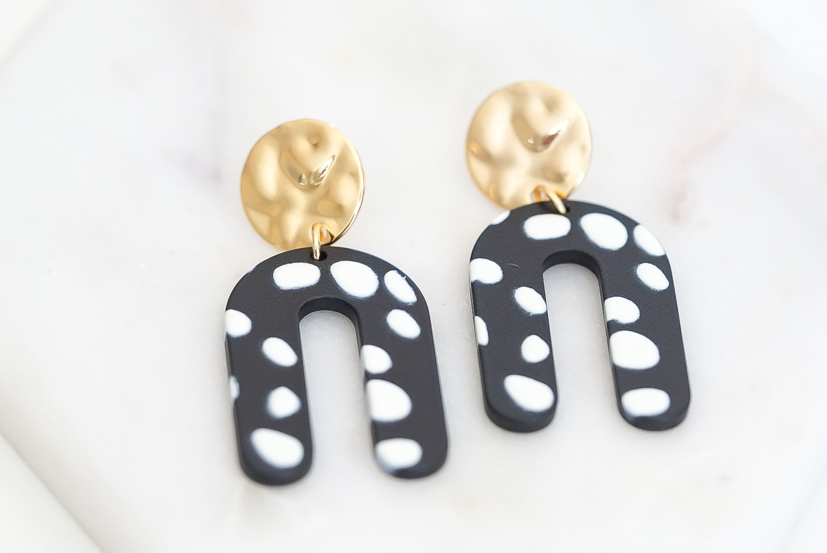 Gold And Black Arch Disc Dotted Hammered Polka Dot Stud Featherweight Hypoallergenic Nickel Free Drop Earrings. Custom Lucite Acrylic Geometric Shapes Accents And Designed With Love In Texas. Size 1.75 Inches Long x .75 Inches Wide With Custom Sizing Available On Select Pieces.