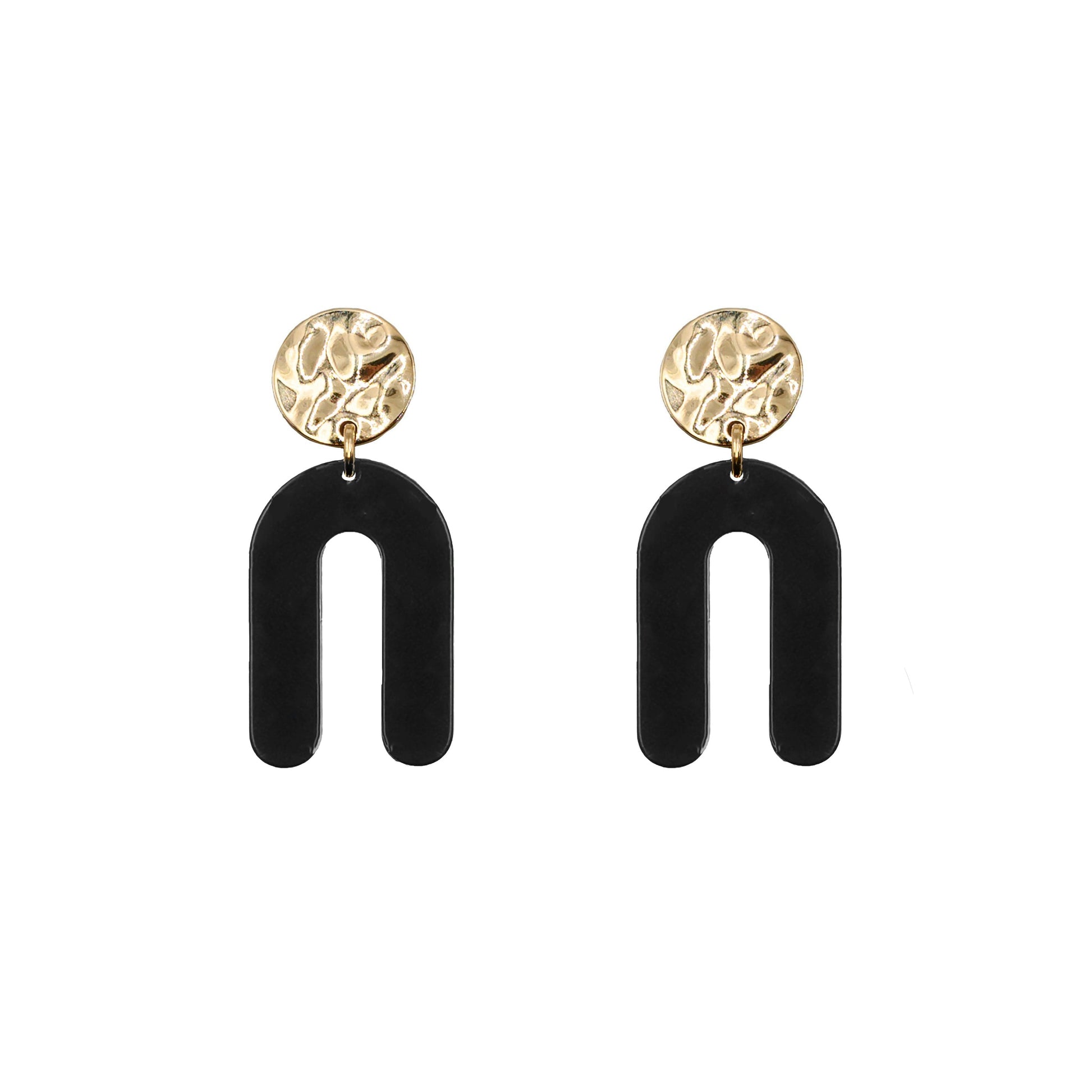 Gold And Black Arch Disc Hammered Stud Featherweight Hypoallergenic Nickel Free Drop Earrings. Custom Lucite Acrylic Geometric Shapes Accents And Designed With Love In Texas. Size 1.75 Inches Long x 1.75 Inches Wide With Custom Sizing Available On Select Pieces.