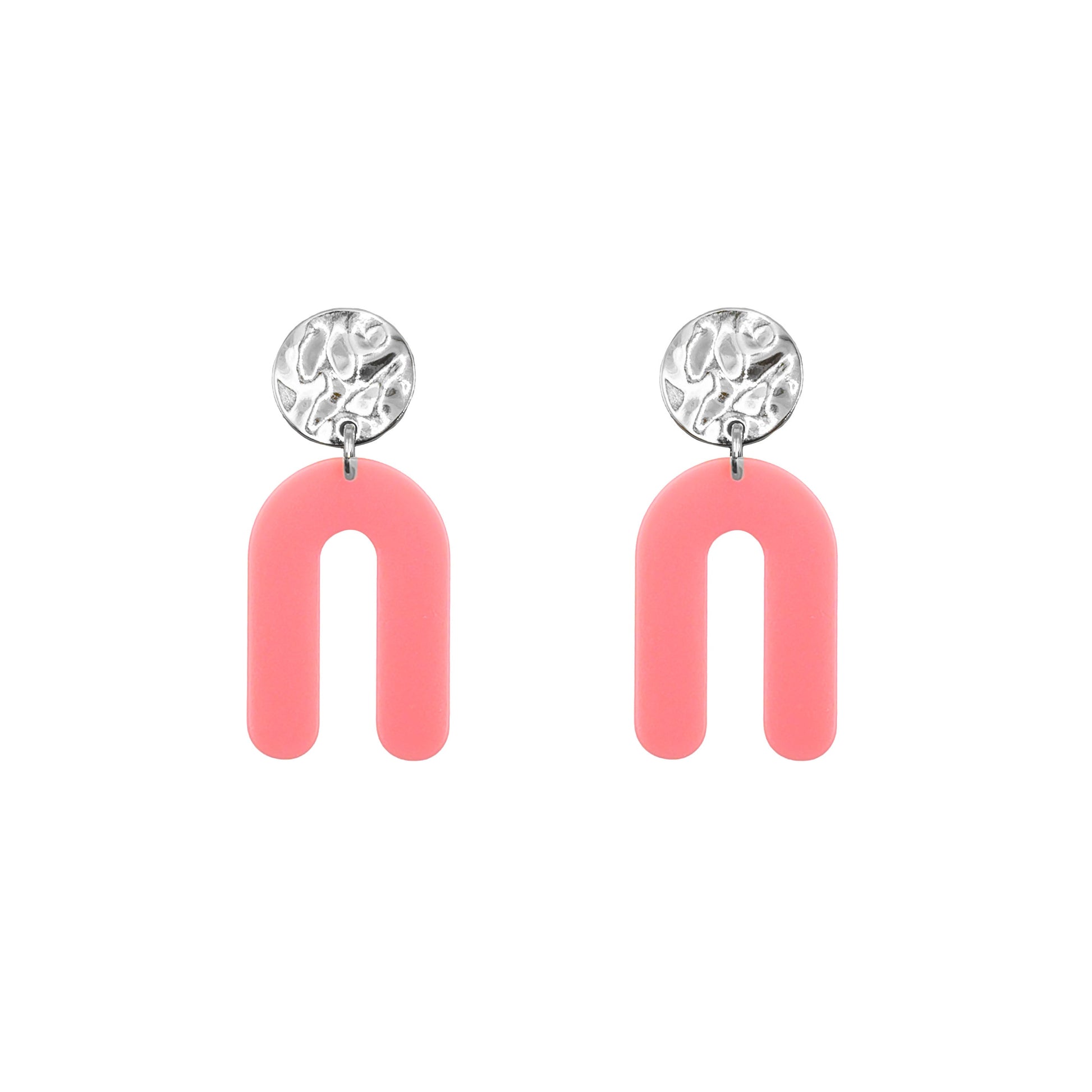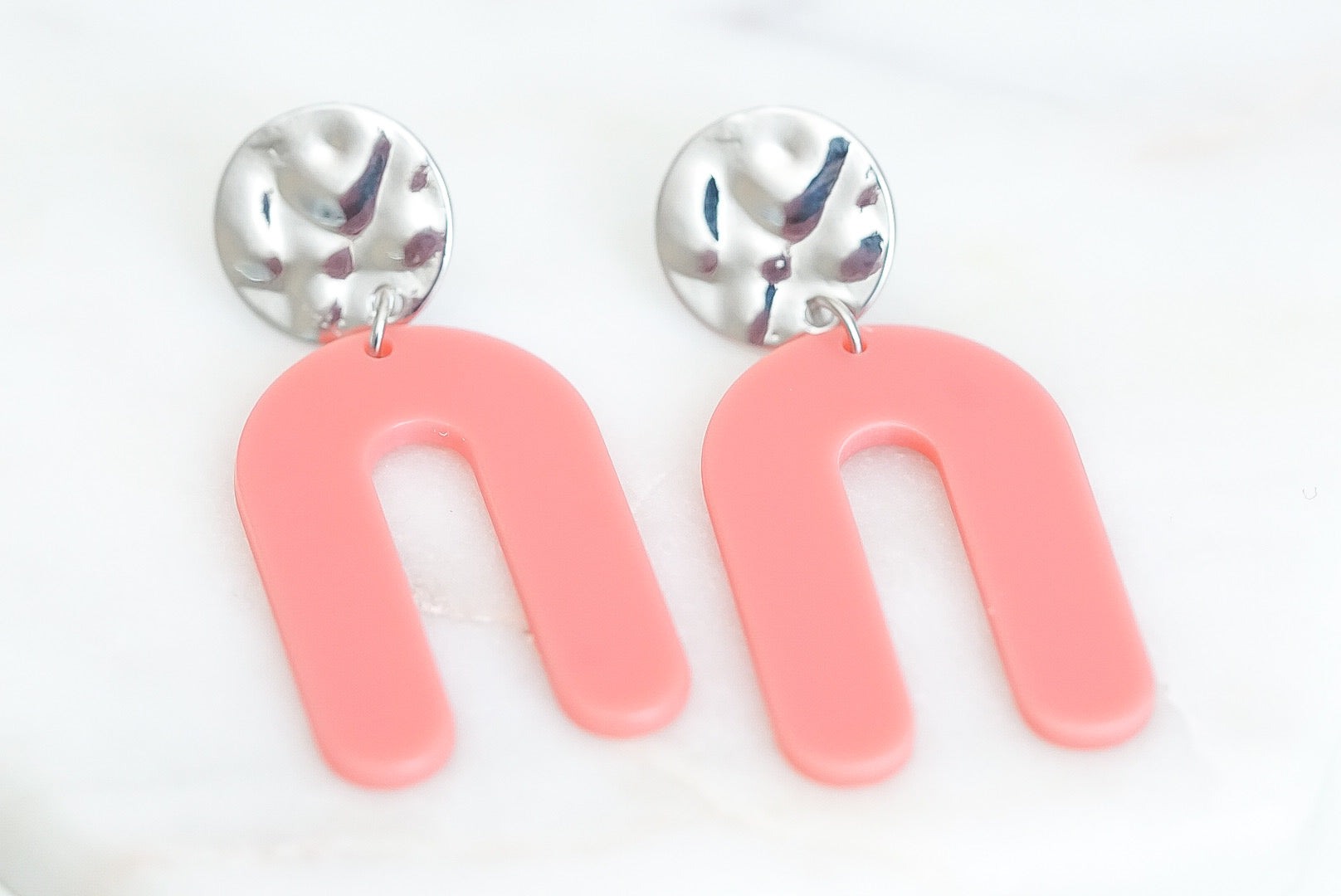 Silver And Pink Arch Disc Hammered Stud Featherweight Hypoallergenic Nickel Free Drop Earrings. Custom Lucite Acrylic Geometric Shapes Accents And Designed With Love In Texas. Size 1.75 Inches Length x 1.75 Inches Wide With Custom Sizing Available On Select Pieces.