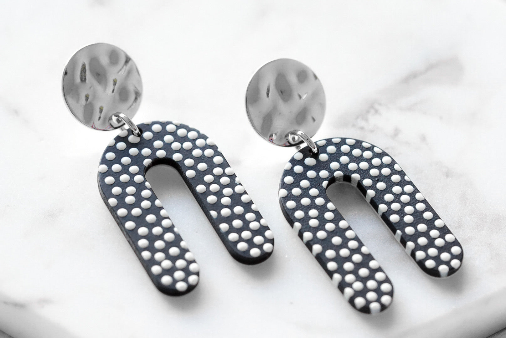 Silver And Black Arch Disc Dotted Hammered Polka Dot Stud Featherweight Hypoallergenic Nickel Free Drop Earrings. Custom Lucite Acrylic Geometric Shapes Accents And Designed With Love In Texas. Size 1.75 Inches Long x .75 Inches Wide With Custom Sizing Available On Select Pieces.