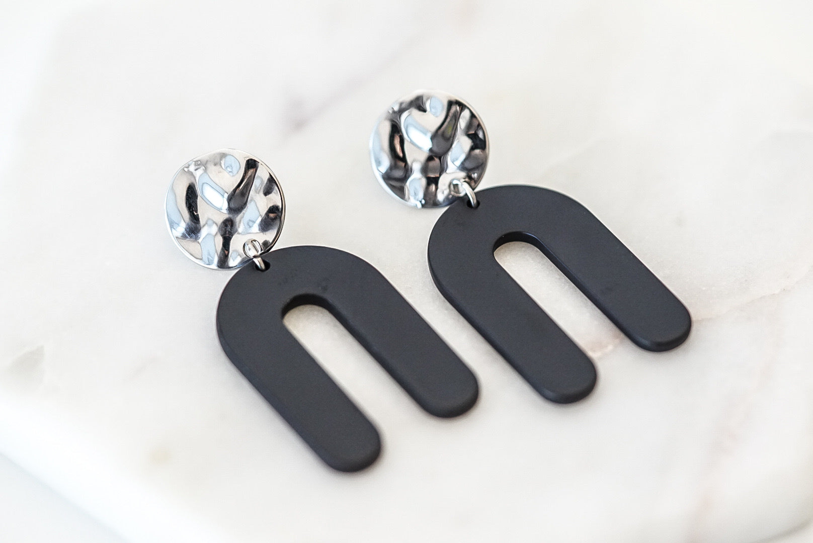 Silver And Black Arch Disc Hammered Stud Hypoallergenic Nickel Free Drop Earrings. Custom Lucite Acrylic Geometric Shapes Accents And Designed With Love In Texas. Size 1.75 Inches Long x .75 Inches Wide With Custom Sizing Available On Select Pieces.