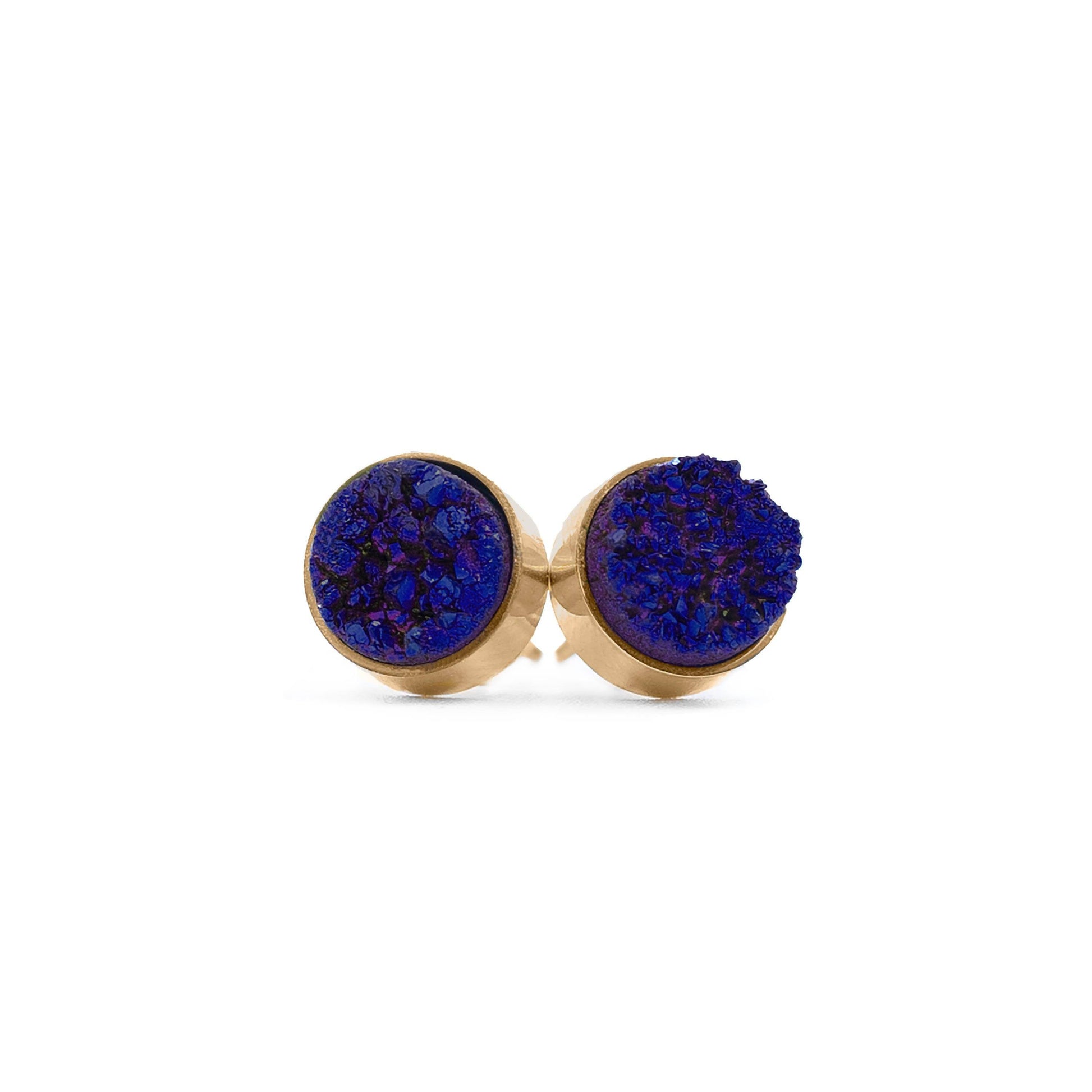 Gold And Purple Cylindrical Druzy Natural Stone Raw Featherweight Hypoallergenic Nickel Free Dainty Stud Earrings. Custom Druzy Raw Natural Quartz Stone Accents And Designed With Love In Texas. Size 8 mm Diameter With Custom Sizing Available On Select Pieces.