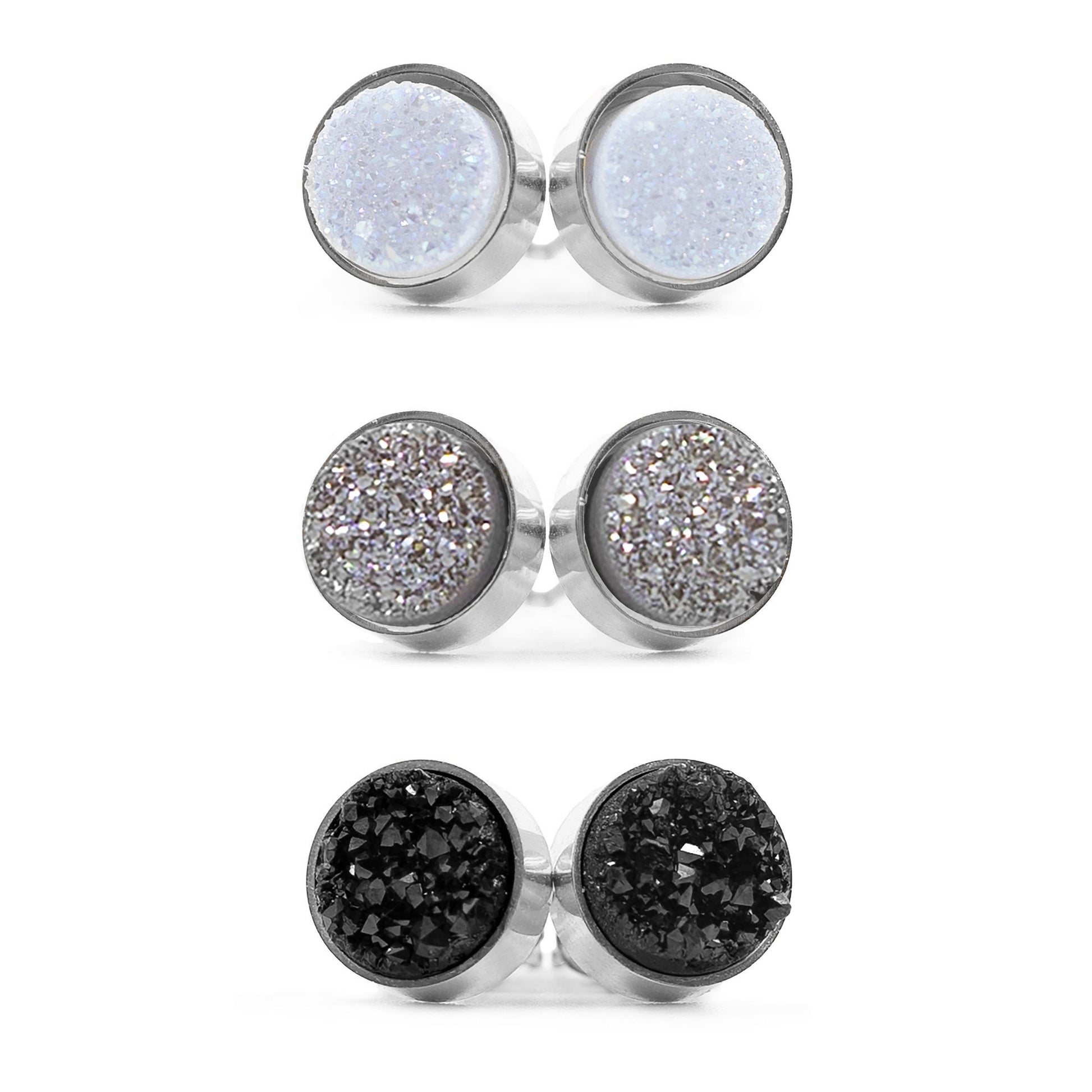 Silver And Black Cylindrical Druzy Natural Stone Raw Featherweight Hypoallergenic Nickel Free Earring Stack Set. Custom Druzy Raw Natural Quartz Stone Accents And Designed With Love In Texas. Size 8mm Diameter With Custom Sizing Available On Select Pieces.