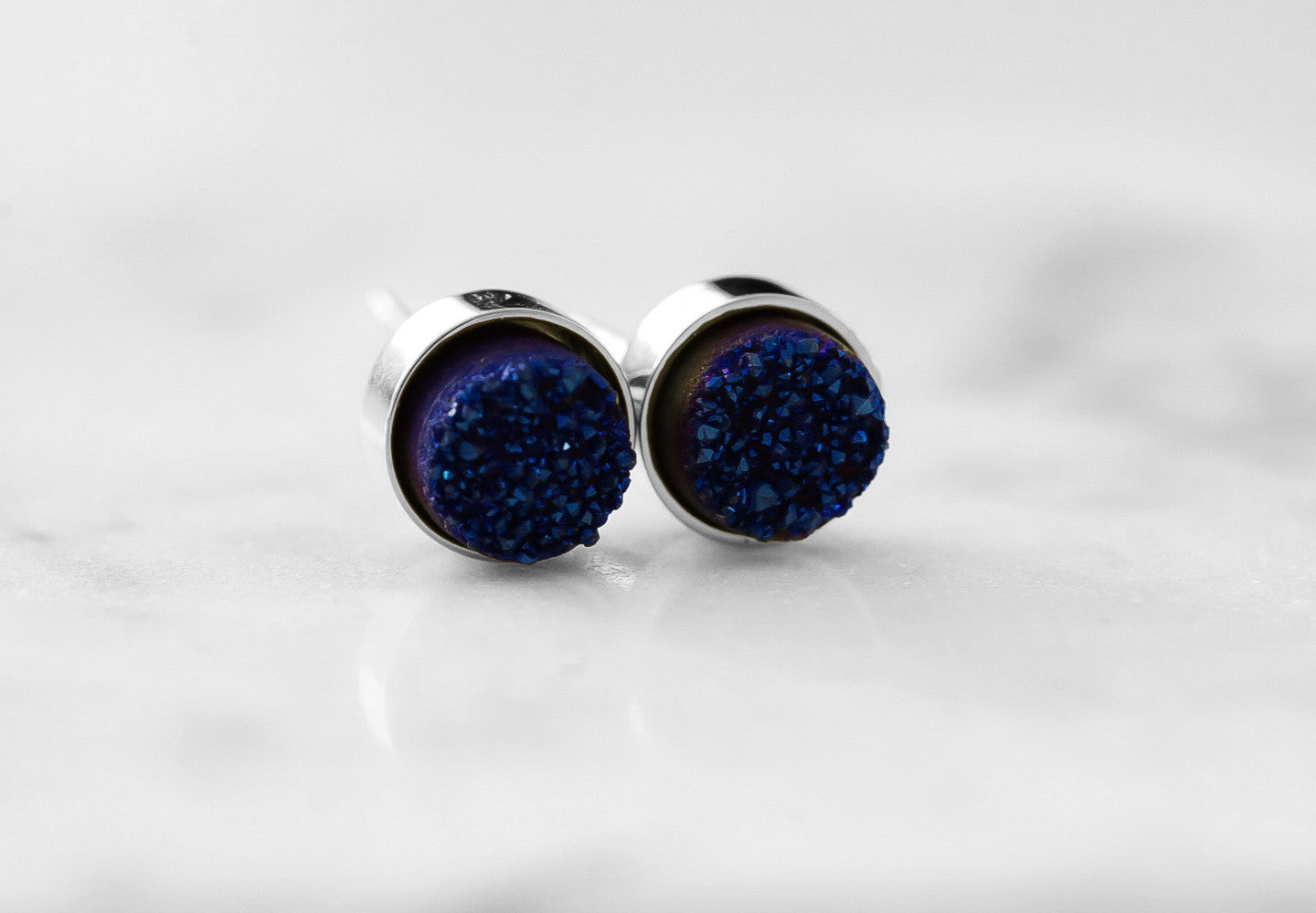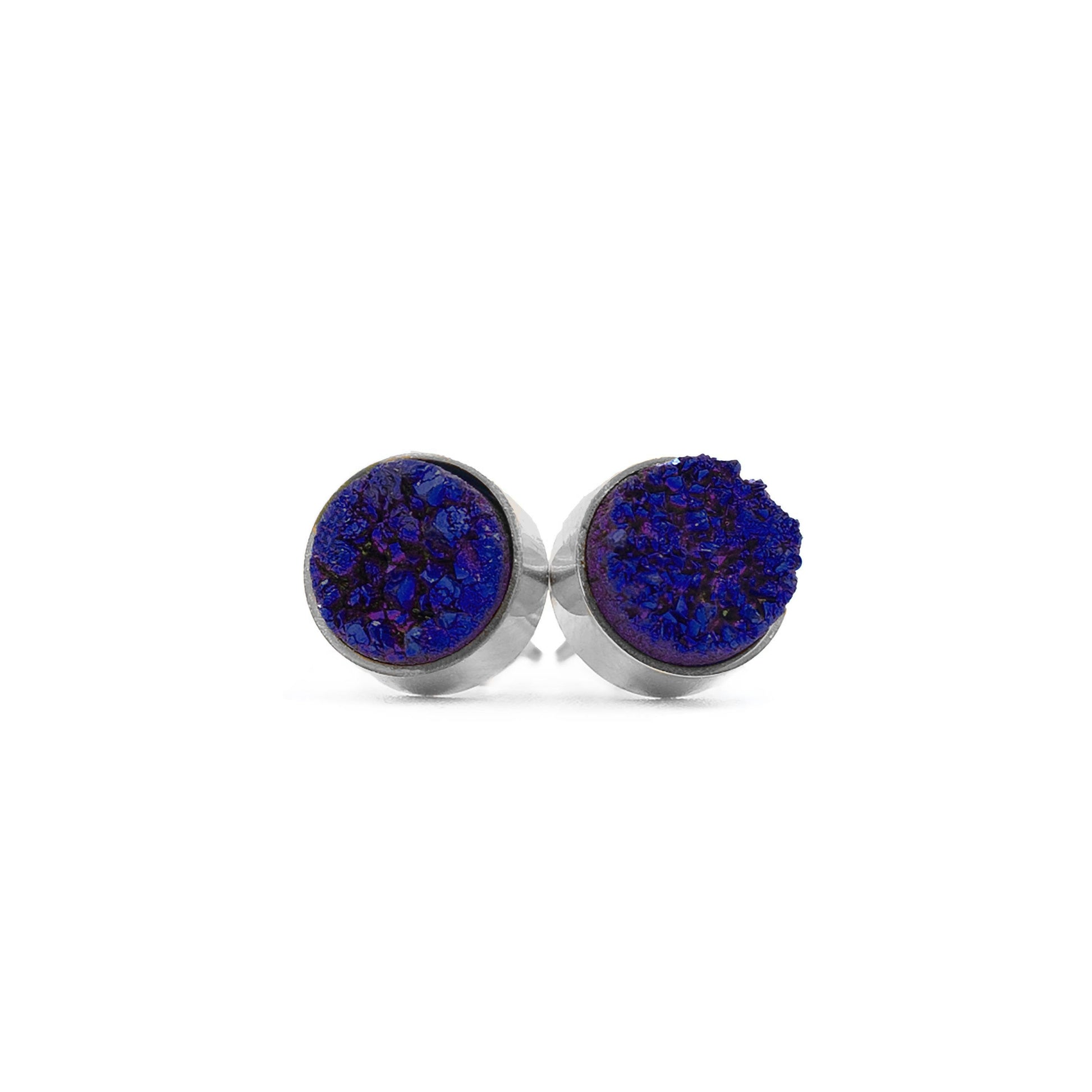 Silver And Purple Cylindrical Druzy Natural Stone Raw Featherweight Hypoallergenic Nickel Free Dainty Stud Earrings. Custom Druzy Raw Natural Quartz Stone Accents And Designed With Love In Texas. Size 8 mm Diameter With Custom Sizing Available On Select Pieces.
