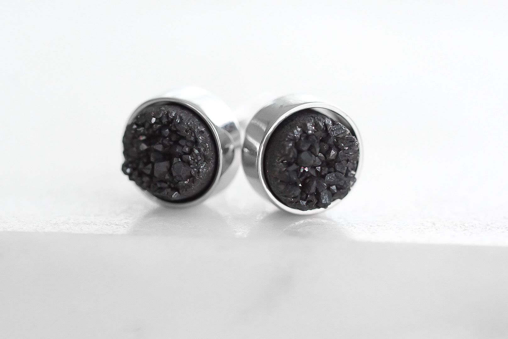 Silver And Black Cylindrical Druzy Natural Stone Raw Featherweight Hypoallergenic Nickel Free Dainty Stud Earrings. Custom Druzy Raw Natural Quartz Stone Accents And Designed With Love In Texas. Size 8mm Diameter With Custom Sizing Available On Select Pieces.