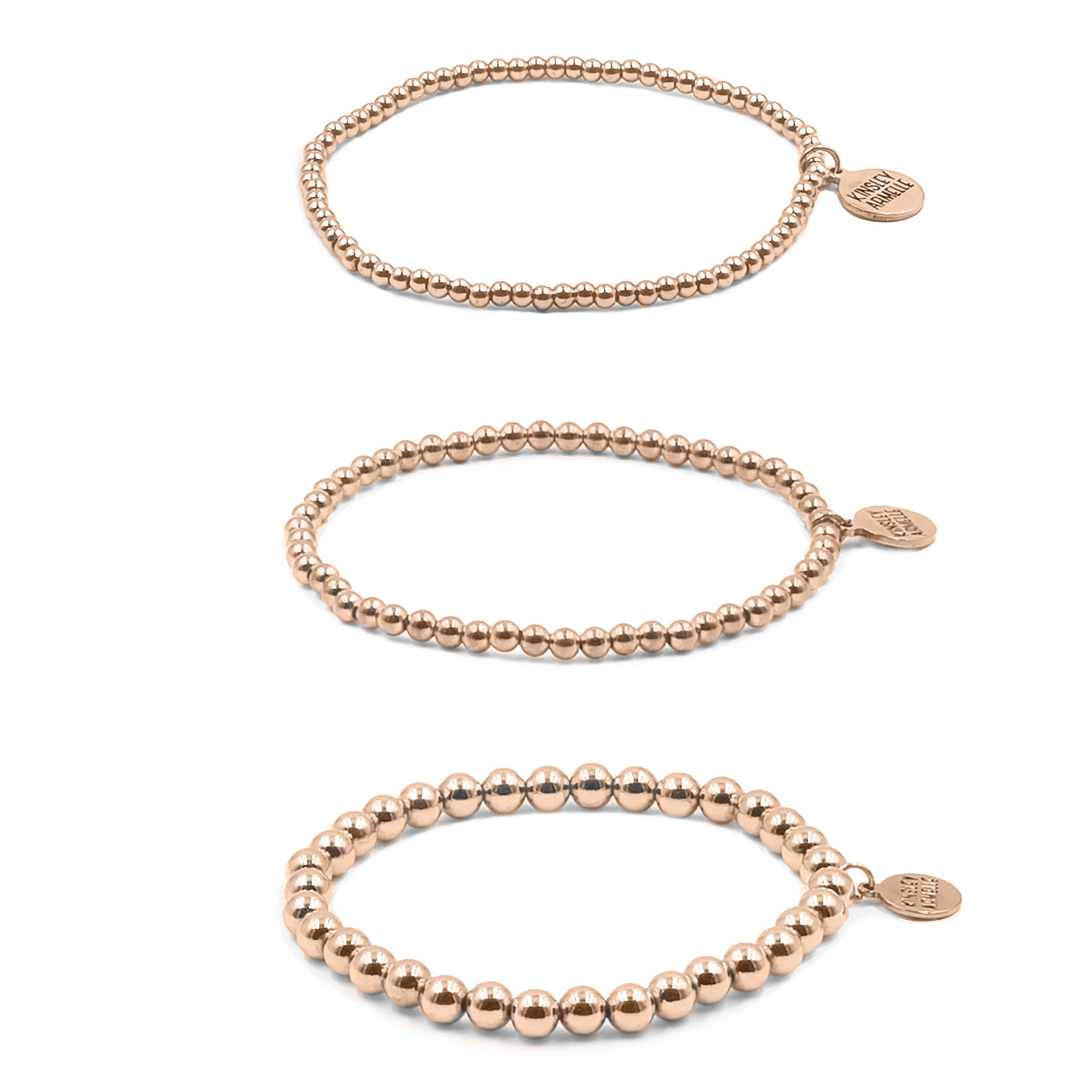 Rose Gold Beads Stackable Hypoallergenic Nickel Free All Metal Bracelet Stack Set. Custom 18K Rose Gold Ion Plated Stainless Steel Charm Accents And Designed With Love In Texas. Size Small, Medium, Large, and Extra Large Ranging From 6.25 - 7.25 Inch Circumference With Custom Sizing Available On Select Pieces.