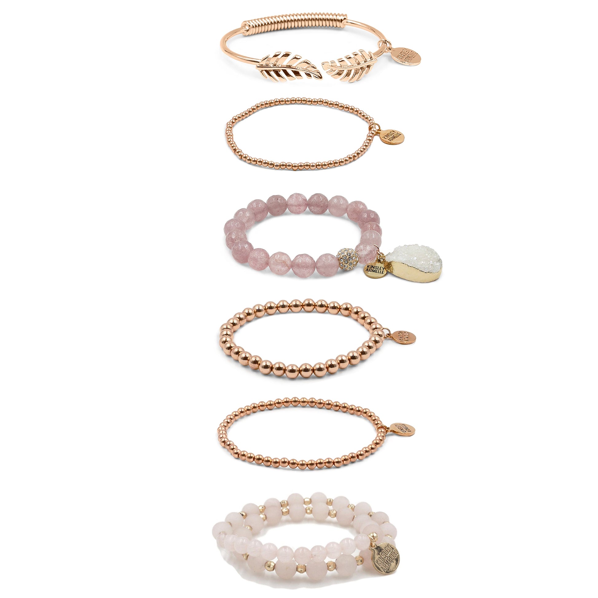 Rose Gold And Red Charm Druzy Leaf Feather Natural Stone Crystal Gemstone Raw Stackable Wrap Hypoallergenic Nickel Free Bracelet Stack Set. Custom Druzy Raw Natural Quartz Stone Accents And Designed With Love In Texas. Size Small, Medium, Large, and Extra Large Ranging From 6.25 - 7.25 Inch Circumference With Custom Sizing Available On Select Pieces.