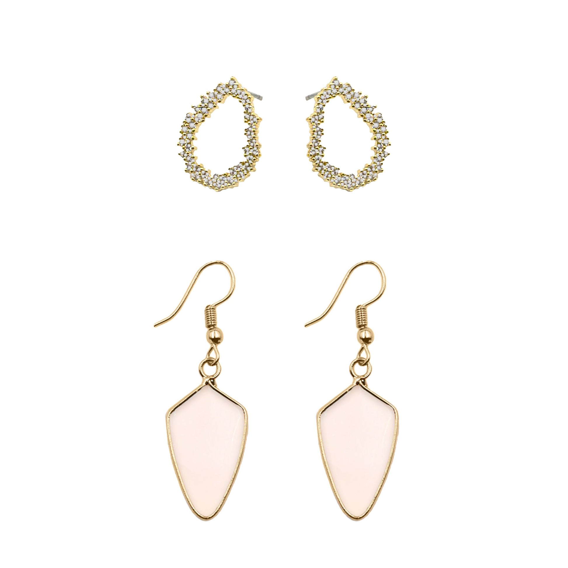 Gold And Pink Arrowhead Drop Inlaid Natural Stone Pave Rhinestone Stud Triangular Featherweight Hypoallergenic Nickel Free Dainty Earring Stack Set. Custom Druzy Raw Natural Quartz Stone Accents And Designed With Love In Texas. Size Studs: 0.5 Inch Width x 0.5 Length | Drops: 1 Inches Length x 0.75 Inches Width With Custom Sizing Available On Select Pieces.