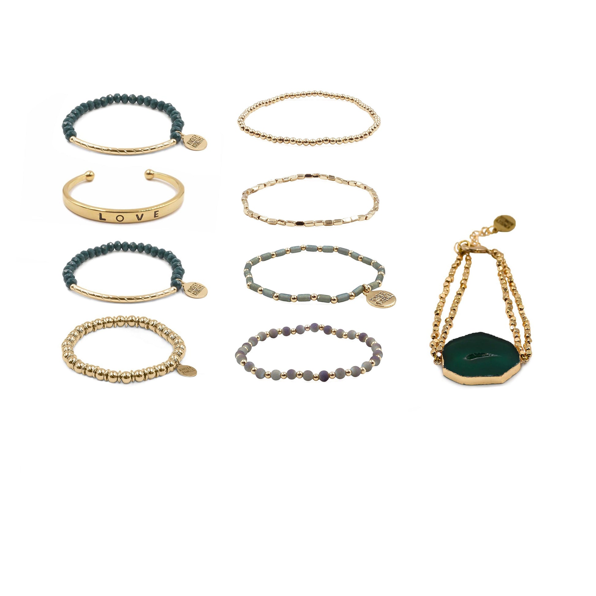 Gold And Green Adjustable Cuff Engraved Faceted Natural Stone Stackable Hypoallergenic Nickel Free Bracelet Stack Set. Custom Agate Slices Raw Natural Stone Accents And Designed With Love In Texas. Size Small, Medium, Large, and Extra Large Ranging From 6.25 - 7.25 Inch Circumference With Custom Sizing Available On Select Pieces.
