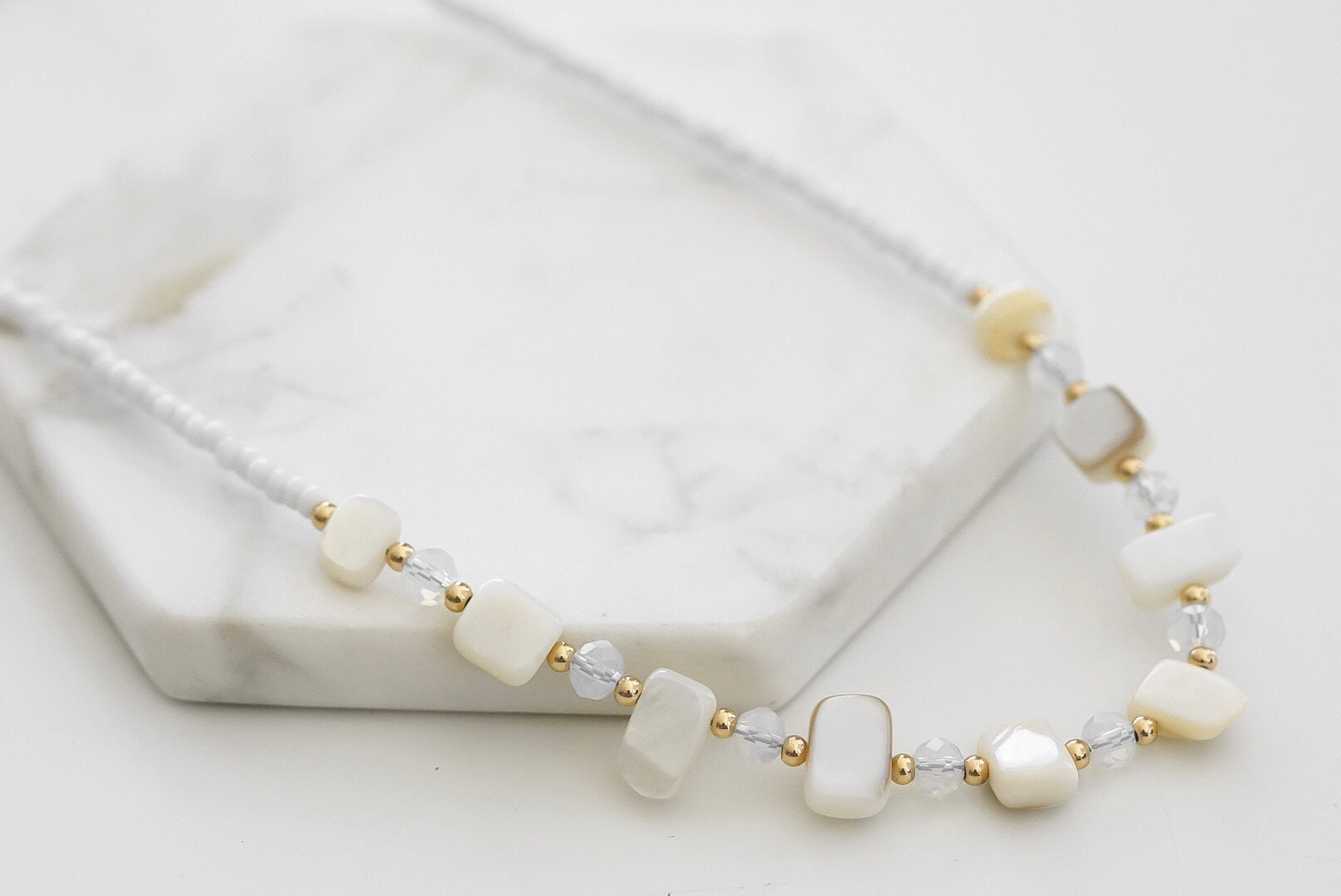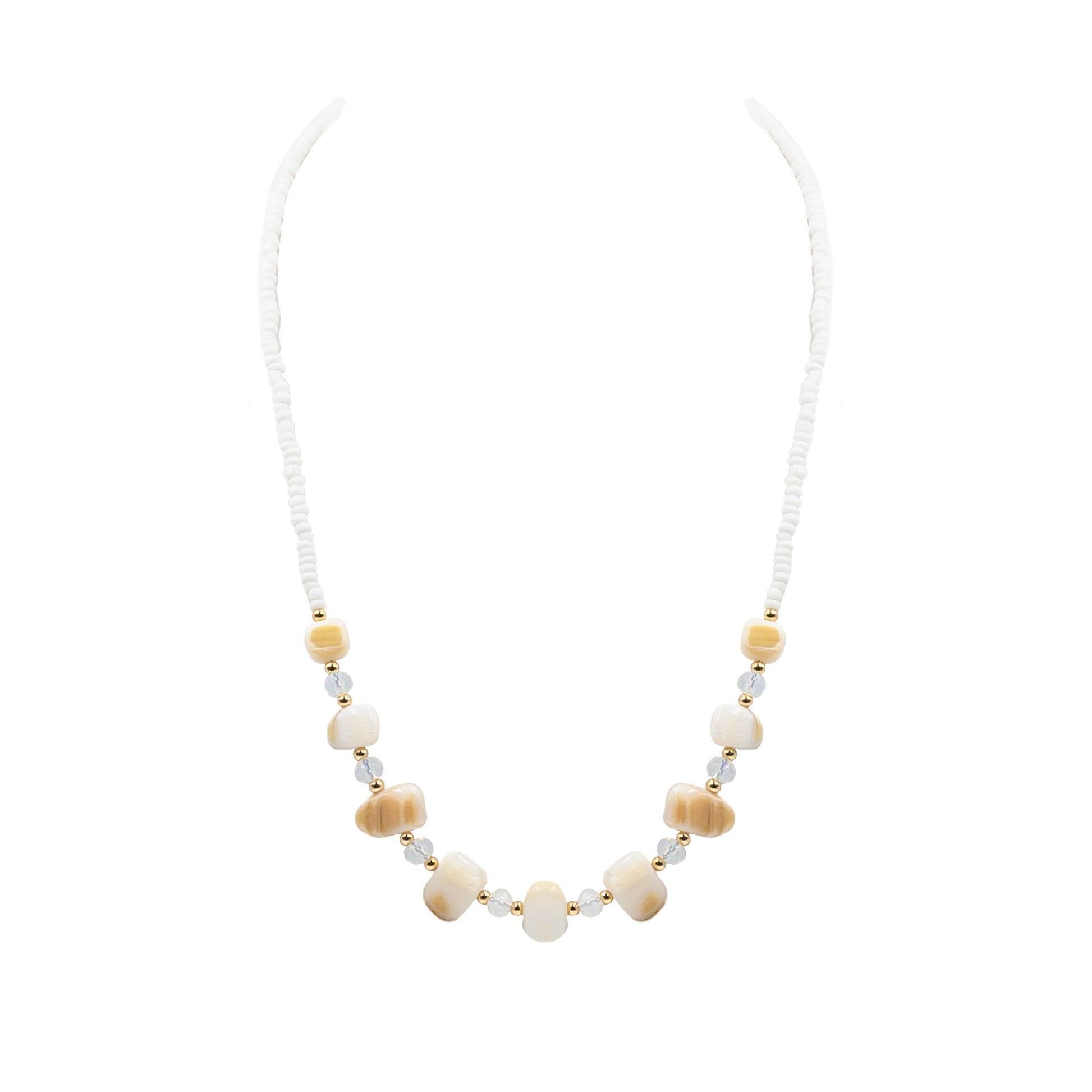 Gold And White Natural Stone Pearl Shell Hypoallergenic Nickel Free Beaded Necklace. Custom Raw Natural Stone Accents And Designed With Love In Texas. Size 16 Inch Length, Plus 3 Inch Attached Necklace Extender With Custom Sizing Available On Select Pieces.