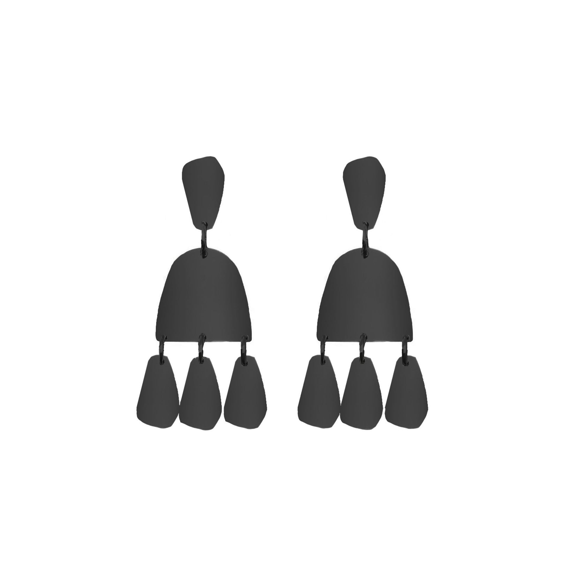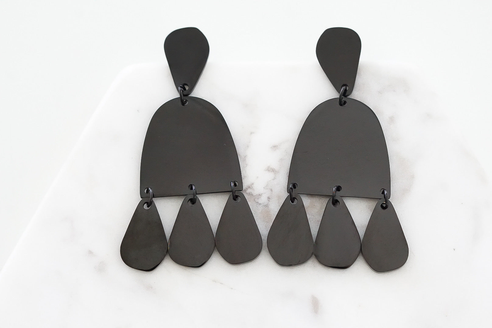Black Dangle Stud Tear Drop Tiered Lightweight Hypoallergenic Nickel Free All Metal Drop Earrings. Custom Geometric Shapes Accents And Designed With Love In Texas. Size 2 Inches Length x 0.75 Inches Width With Custom Sizing Available On Select Pieces.