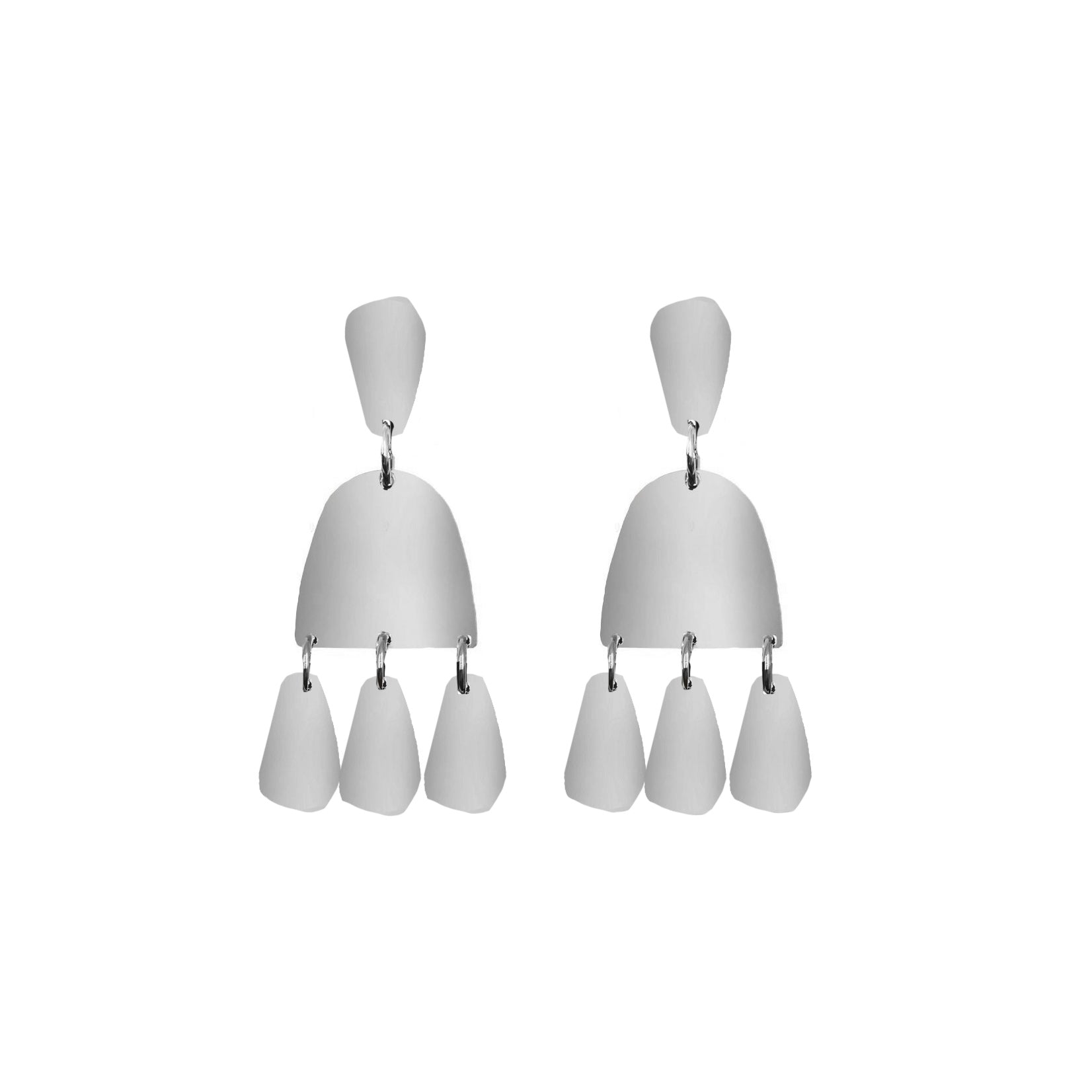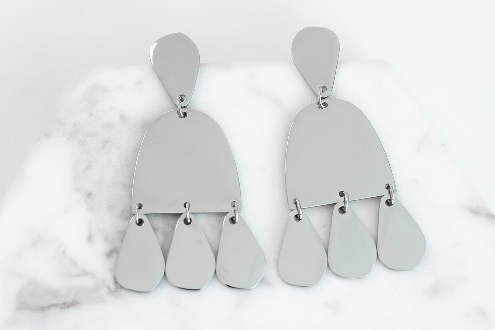 Silver Dangle Stud Tear Drop Tiered Lightweight Hypoallergenic Nickel Free All Metal Drop Earrings. Custom Geometric Shapes Accents And Designed With Love In Texas. Size 2 Inches Length x 0.75 Inches Width With Custom Sizing Available On Select Pieces.