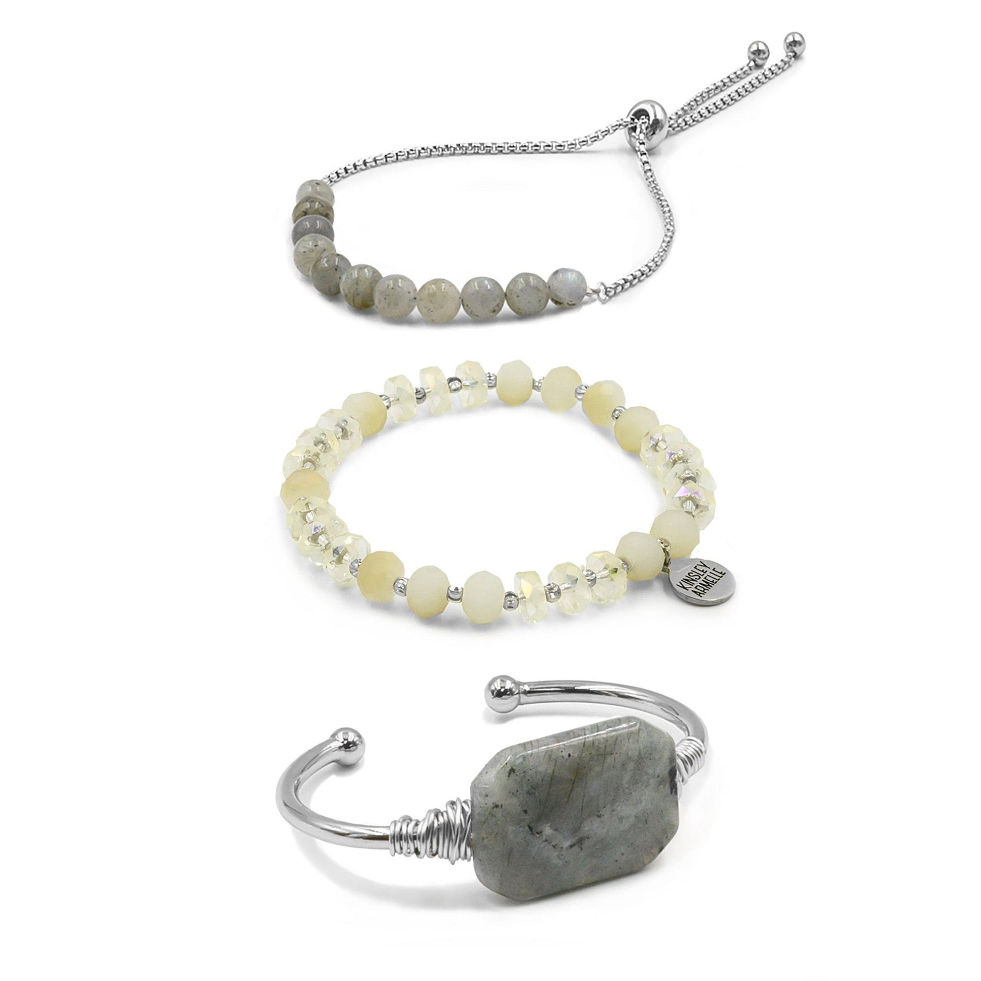 Silver And Green Beads Cuff Hypoallergenic Nickel Free Bracelet Stack Set. Custom Labradorite Raw Natural Stone Accents And Designed With Love In Texas. Size Small, Medium, Large, and Extra Large Ranging From 6.25 - 7.25 Inch Circumference With Custom Sizing Available On Select Pieces.