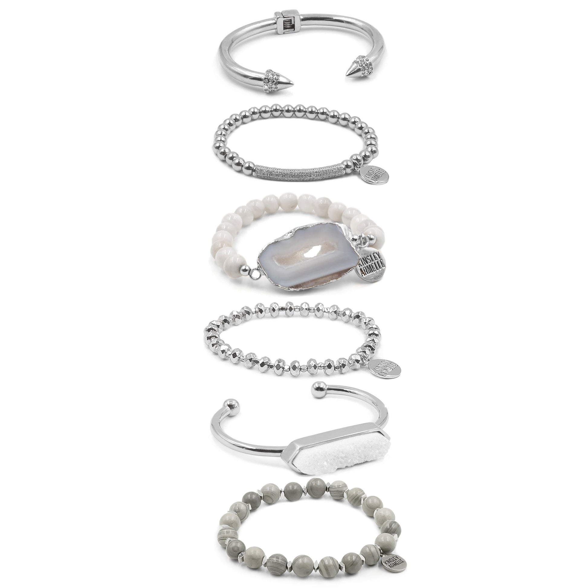 Silver And Gray Agate Slices Cuff Druzy Hinged Natural Stone Crystal Gemstone Neutral Pave Point Raw Spike Stackable Hypoallergenic Nickel Free Bracelet Stack Set. Custom Druzy Raw Natural Quartz Stone Accents And Designed With Love In Texas. Size Small, Medium, Large, and Extra Large Ranging From 6.25 - 7.25 Inch Circumference With Custom Sizing Available On Select Pieces.