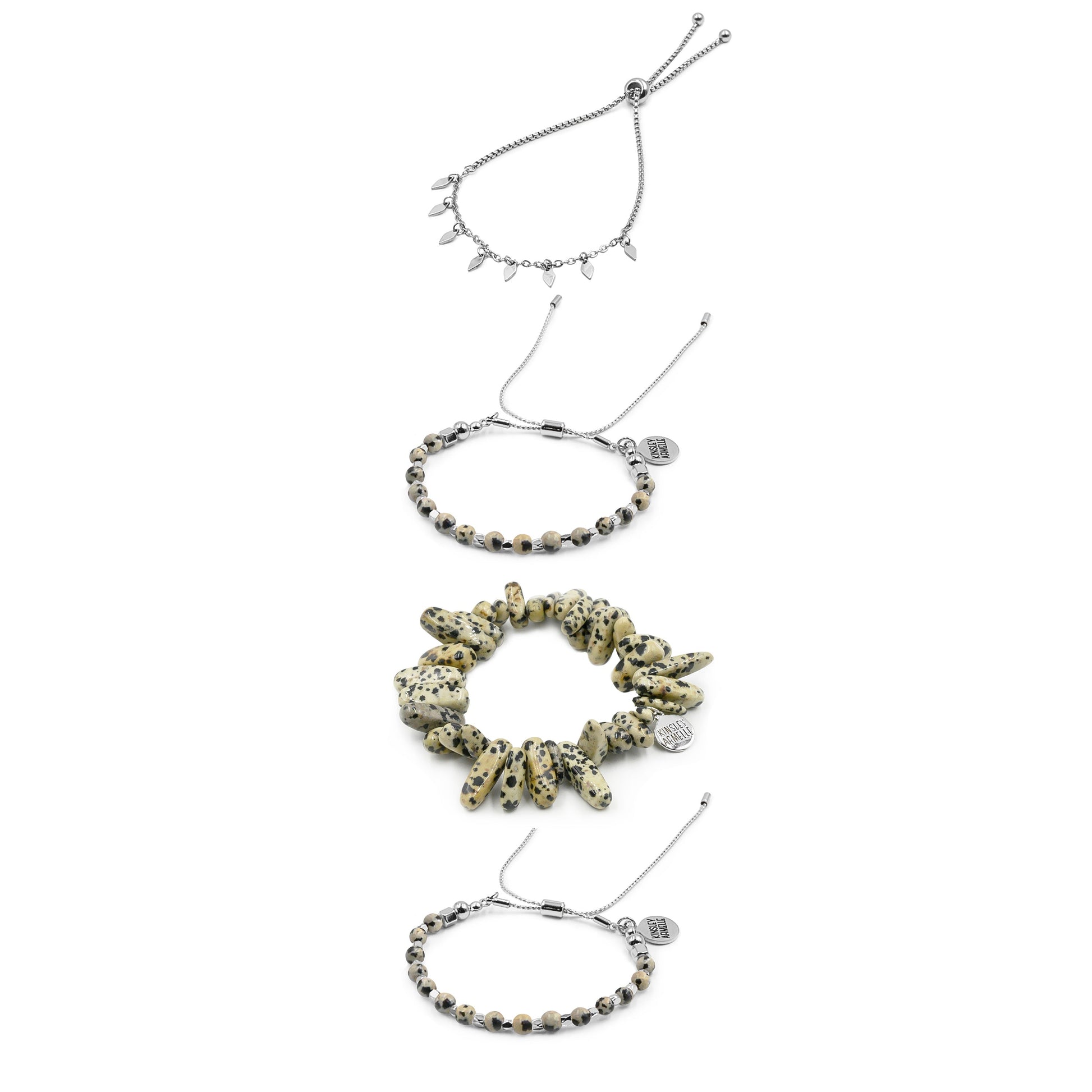 Silver And Brown Cheetah Leopard Spotted Stackable Hypoallergenic Nickel Free Bracelet Stack Set. Custom Dalmatian Jasper Raw Natural Stone Accents And Designed With Love In Texas. Size Small, Medium, Large, and Extra Large Ranging From 6.25 - 7.25 Inch Circumference With Custom Sizing Available On Select Pieces.