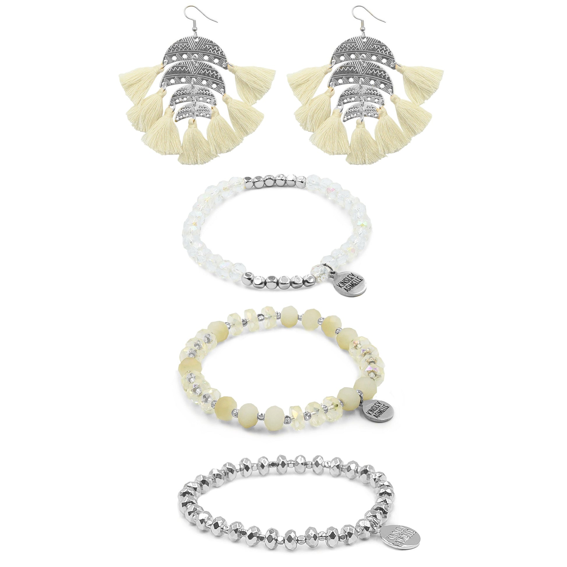 Silver And Brown Aztec Beads Drop Earrings Fringe Jewelry Set Tan Tassel Hypoallergenic Nickel Free Jewelry & Bracelet Stack Set. Custom Linen Tassels Accents And Designed With Love In Texas. Size Small, Medium, Large, and Extra Large Ranging From Bracelets: 6.25 - 7.25 Inch Circumference | Earrings: 3.5 Inch Length x 1.5 Inch Width With Custom Sizing Available On Select Pieces.
