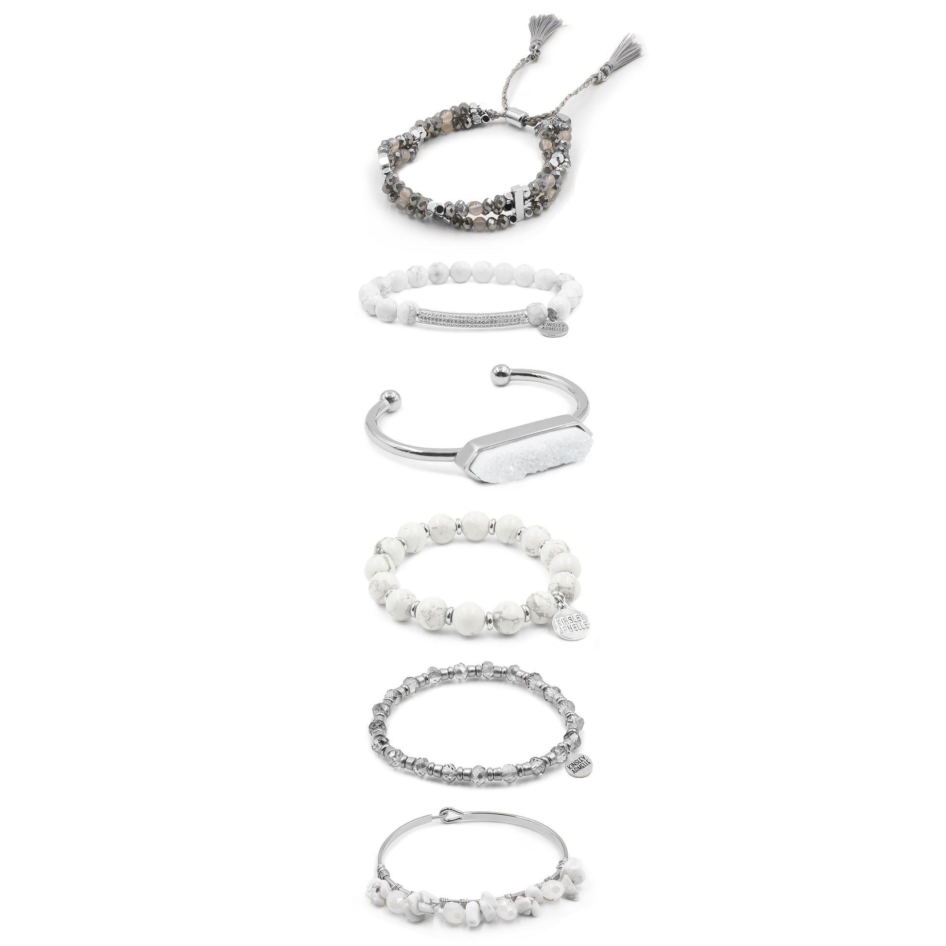 Silver And Gray Beads Chip Cuff Marble Raw Hypoallergenic Nickel Free Bracelet Stack Set. Custom Druzy Raw Natural Quartz Stone Accents And Designed With Love In Texas. Size Small, Medium, Large, and Extra Large Ranging From 6.25 - 7.25 Inch Circumference With Custom Sizing Available On Select Pieces.