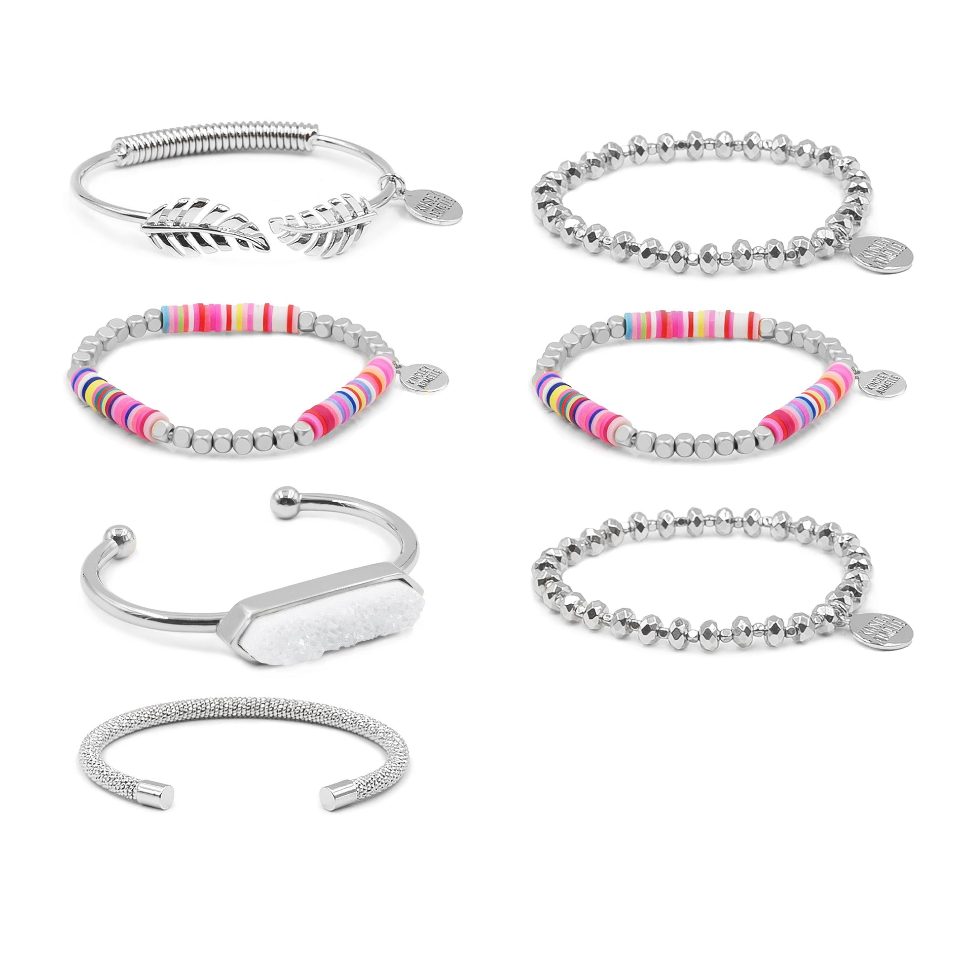 Silver And Pink Cuff Heishi Leaf Feather Natural Stone Rainbow Raw Wire Wrapped Hypoallergenic Nickel Free Bracelet Stack Set. Custom Druzy Raw Natural Quartz Stone Accents And Designed With Love In Texas. Size Small, Medium, Large, and Extra Large Ranging From 6.25 - 7.25 Inch Circumference With Custom Sizing Available On Select Pieces.