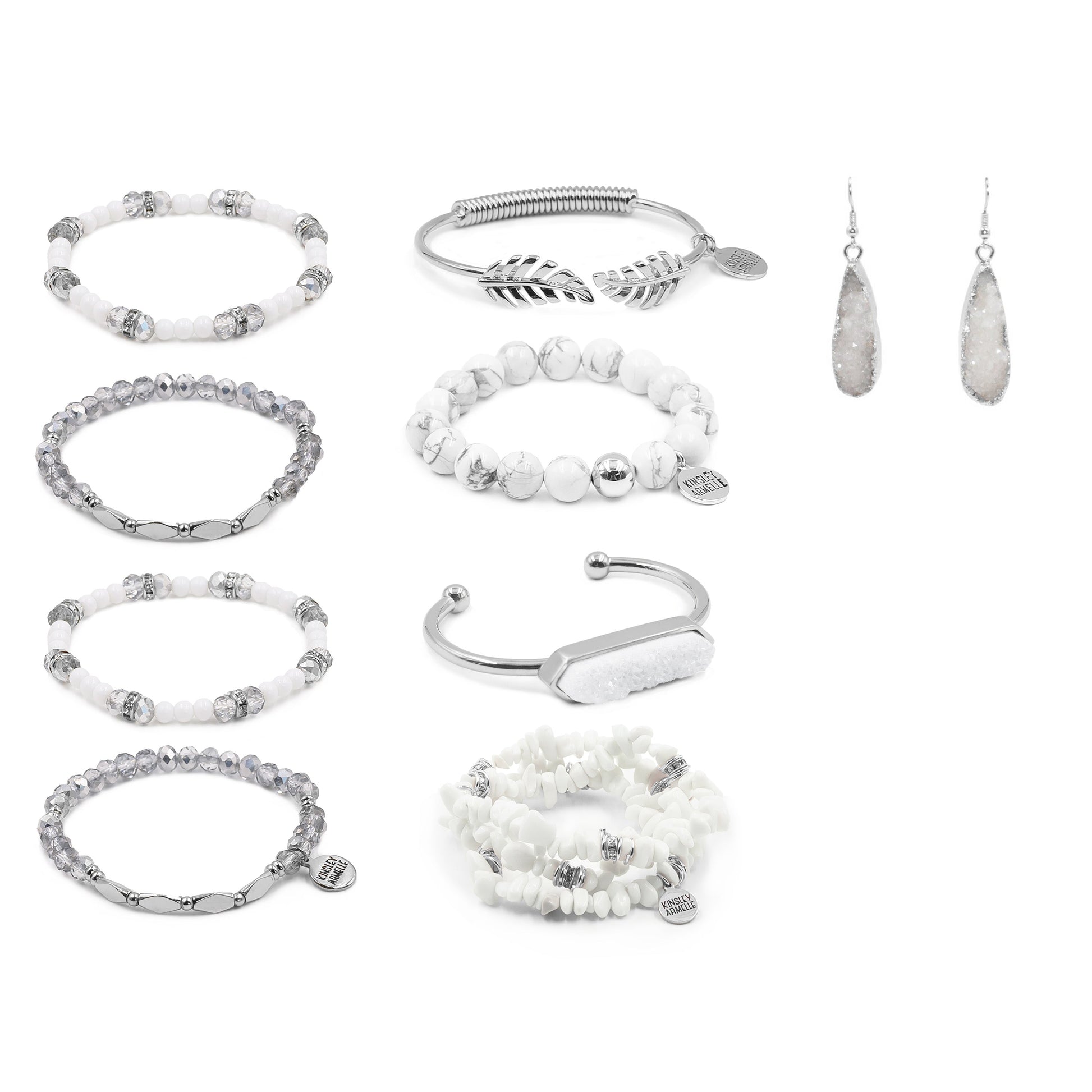 Silver And White Chip Chunky Dangle Earrings Multistrand Stackable Hypoallergenic Nickel Free Jewelry & Bracelet Stack Set. Custom Druzy Raw Natural Quartz Stone Accents And Designed With Love In Texas. Size Small, Medium, Large, and Extra Large Ranging From Bracelets: 6.25 - 7.25 Inch Circumference | Earrings: 1.75 Inch Length x 0.5 Inch Width With Custom Sizing Available On Select Pieces.
