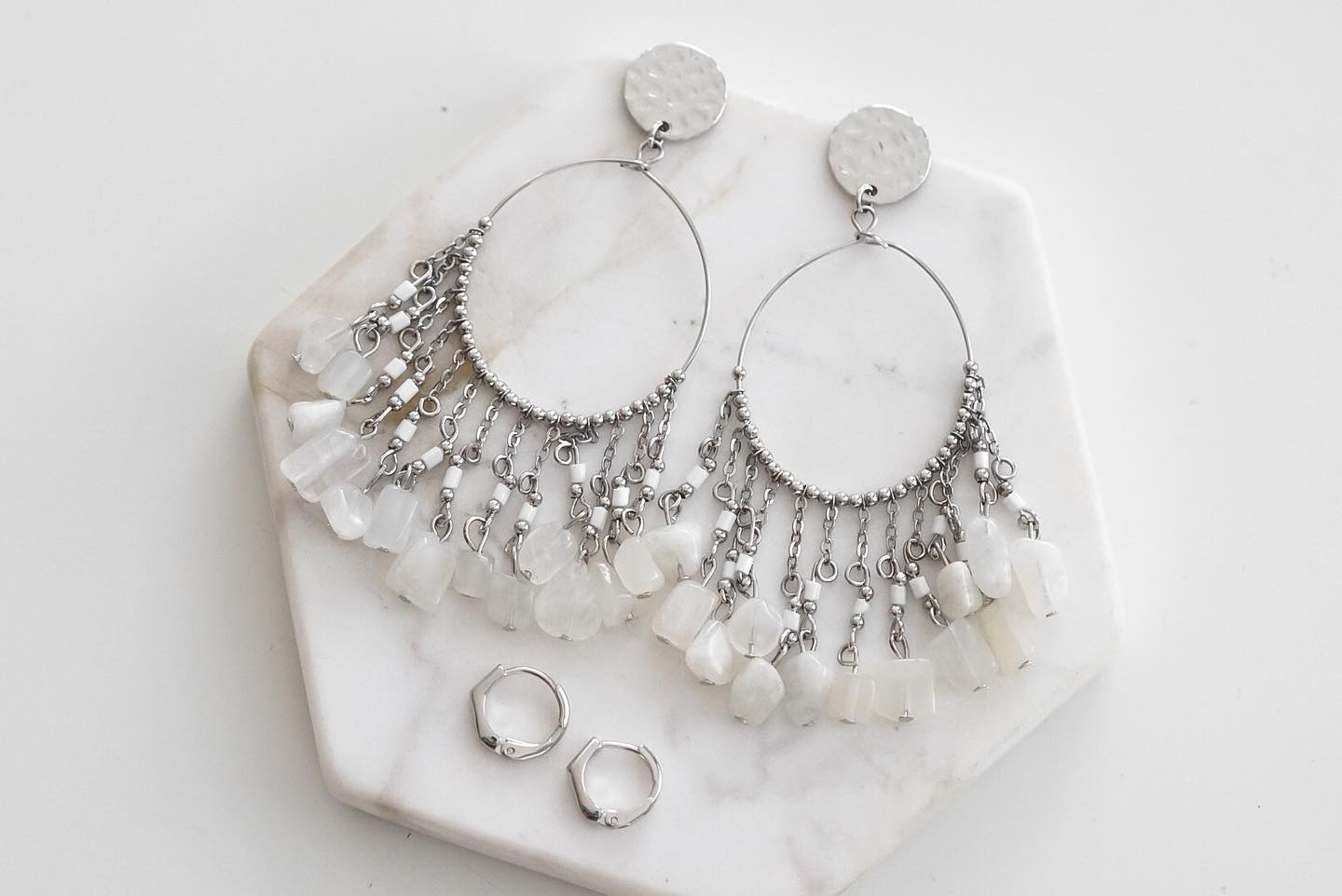 Silver And Gray Boho Drop Fringe Hexagon Huggie Pave Stud Featherweight Hypoallergenic Nickel Free Dainty Earring Stack Set. Custom Druzy Raw Natural Quartz Stone Accents And Designed With Love In Texas. Size Goddess Collection - Omega Earrings: 1cm Length x 1cm Width | Sofie Collection - Perla Earrings: 3.5 Inches Length x 1.5 Inches Width With Custom Sizing Available On Select Pieces.