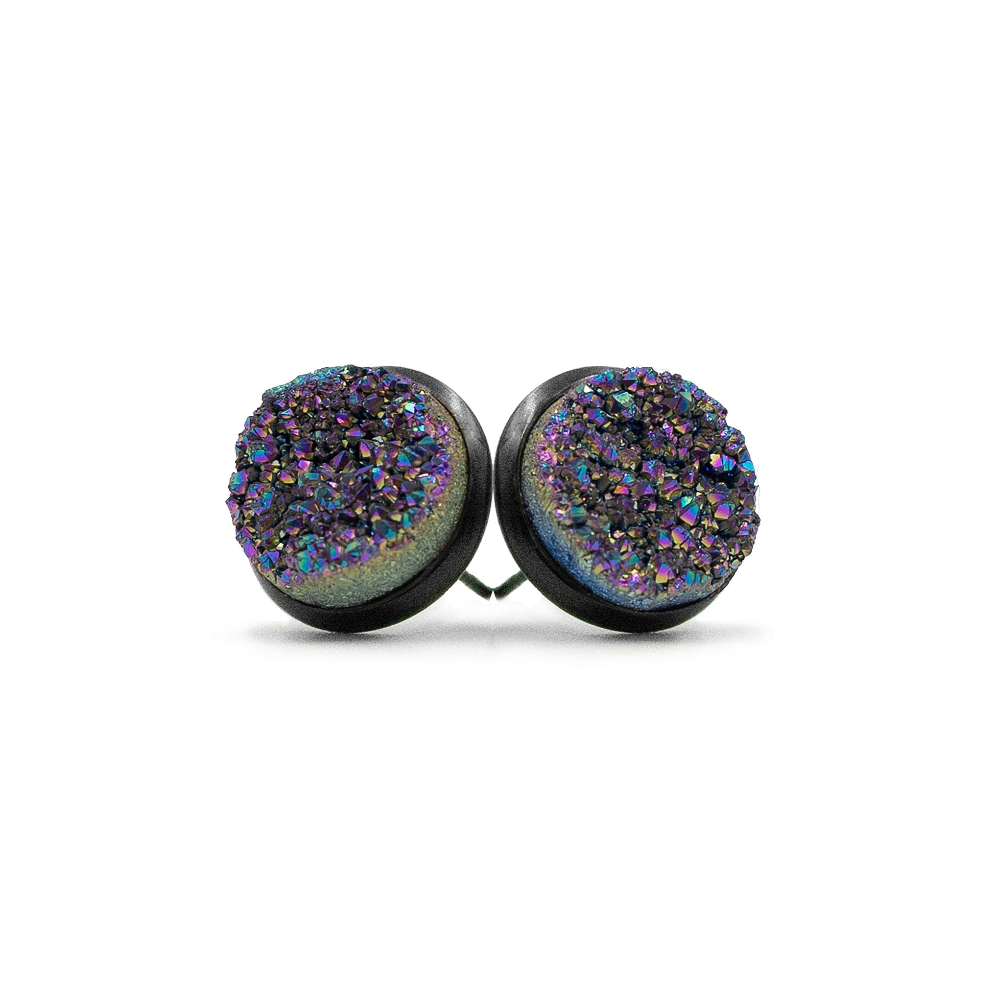 Black And Purple Featherweight Hypoallergenic Nickel Free Stud Earrings. Custom Druzy Raw Natural Quartz Stone Accents And Designed With Love In Texas. Size 10mm Diameter With Custom Sizing Available On Select Pieces.