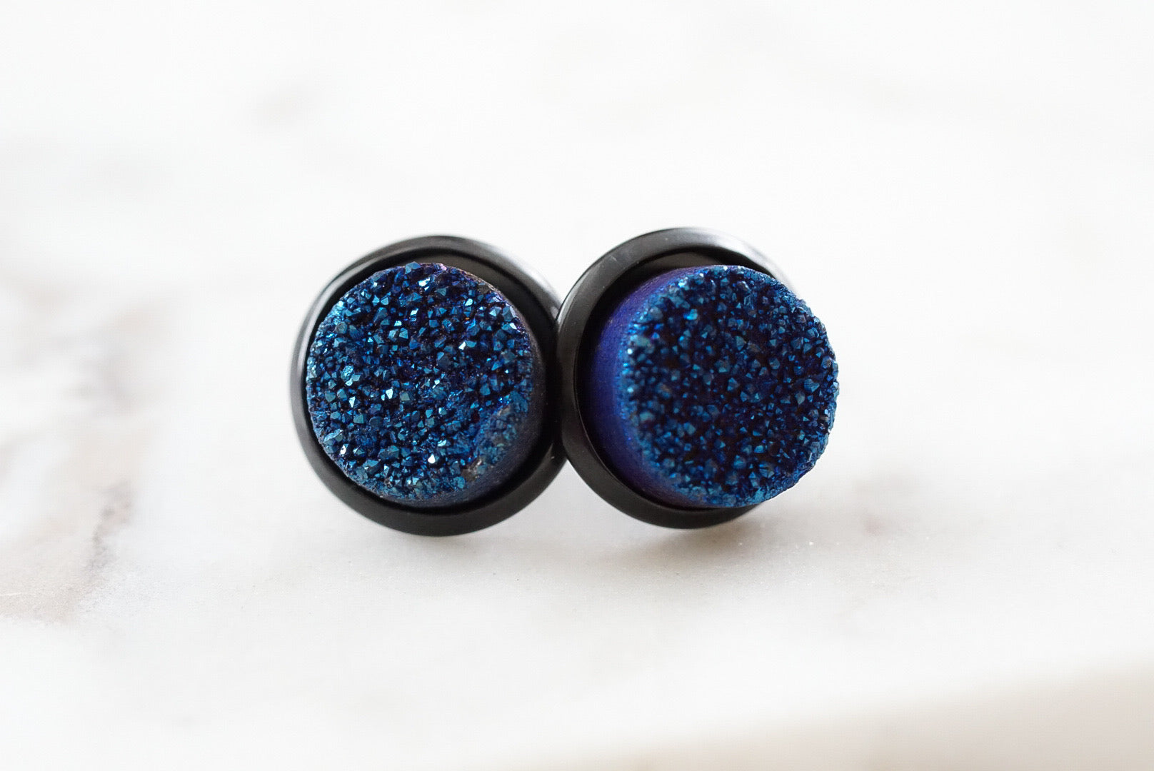 Black And Blue Featherweight Hypoallergenic Nickel Free Stud Earrings. Custom Druzy Raw Natural Quartz Stone Accents And Designed With Love In Texas. Size 10mm Diameter With Custom Sizing Available On Select Pieces.
