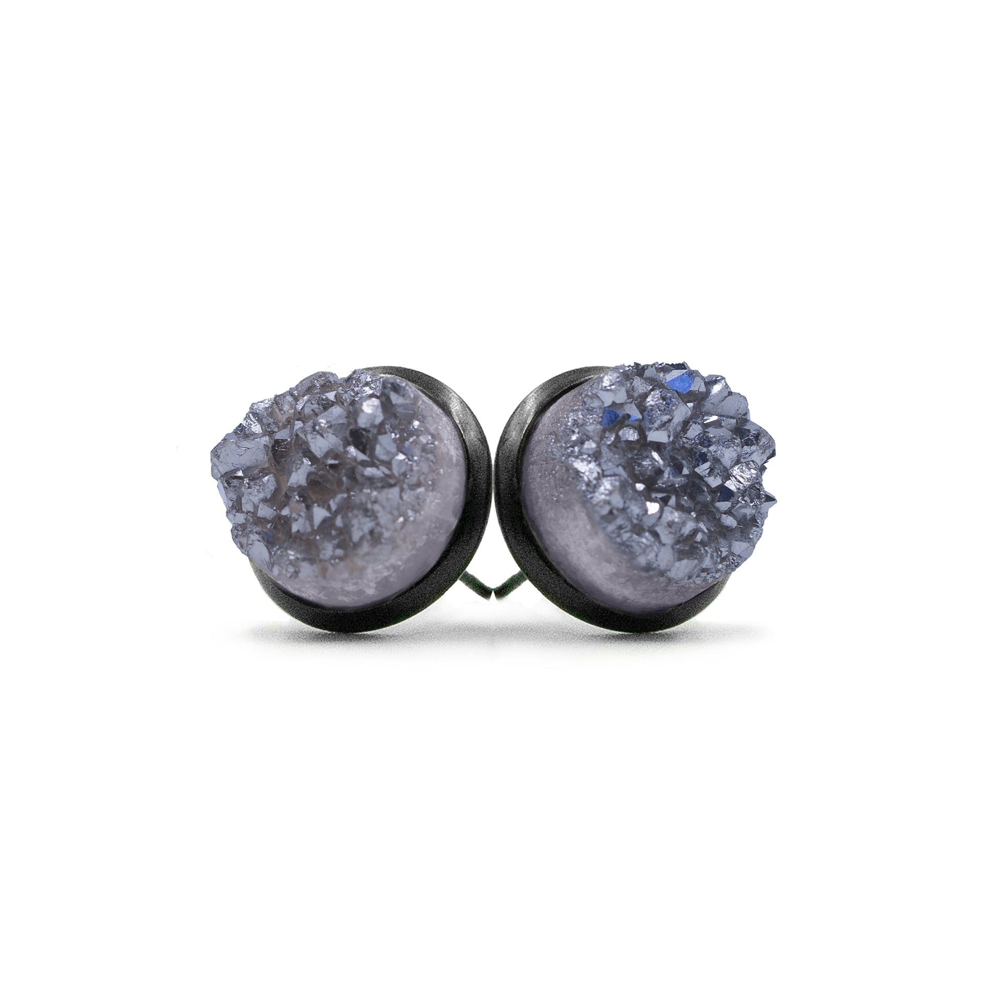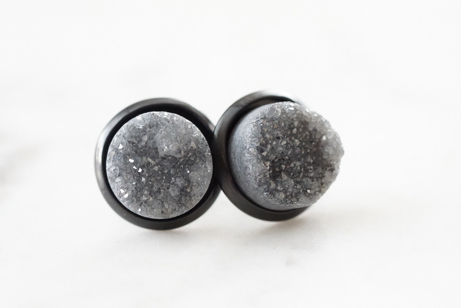 Black And Gray Featherweight Hypoallergenic Nickel Free Stud Earrings. Custom Druzy Raw Natural Quartz Stone Accents And Designed With Love In Texas. Size 10mm Diameter With Custom Sizing Available On Select Pieces.