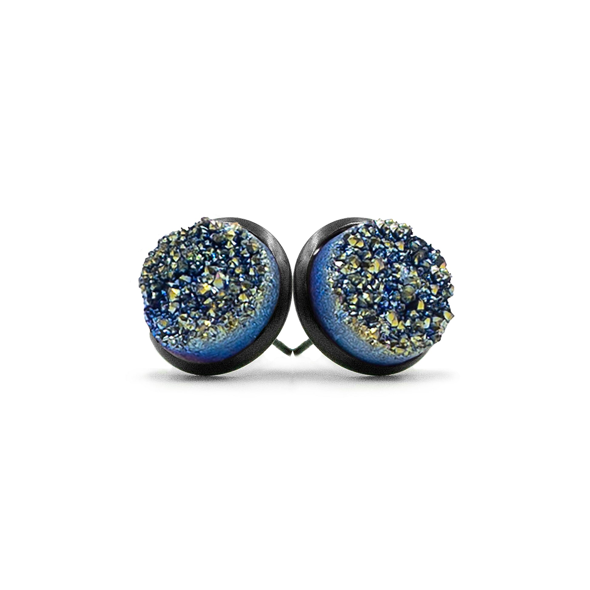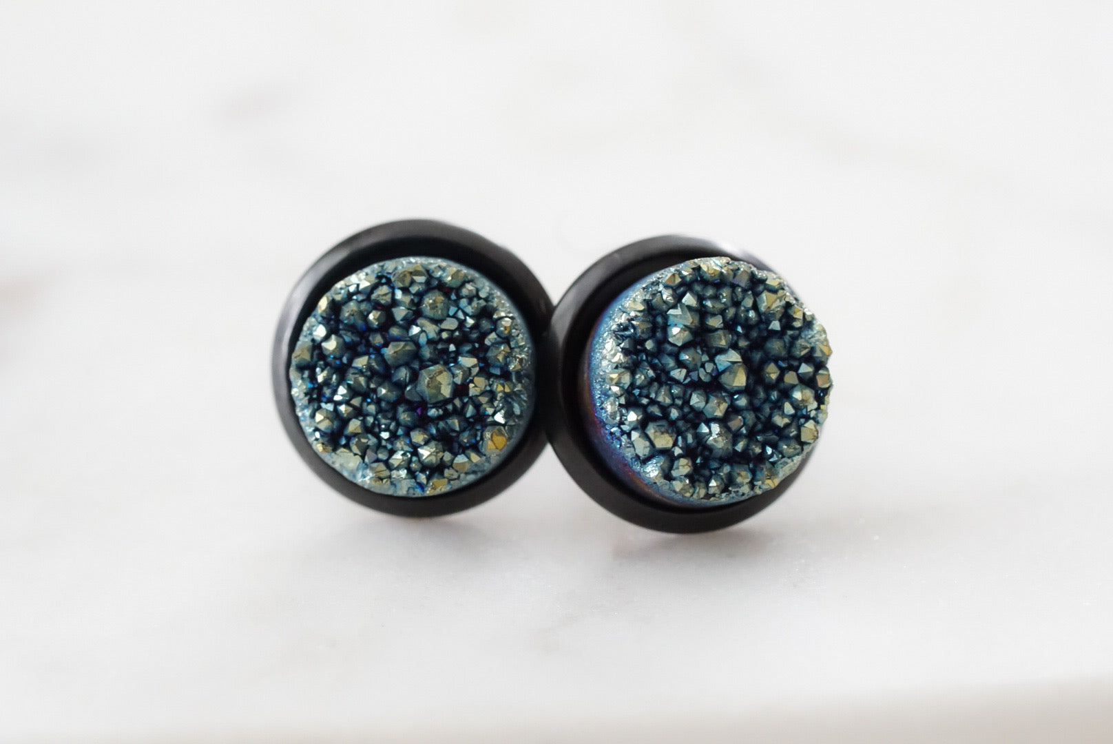 Black And Green Featherweight Hypoallergenic Nickel Free Stud Earrings. Custom Druzy Raw Natural Quartz Stone Accents And Designed With Love In Texas. Size 10mm Diameter With Custom Sizing Available On Select Pieces.