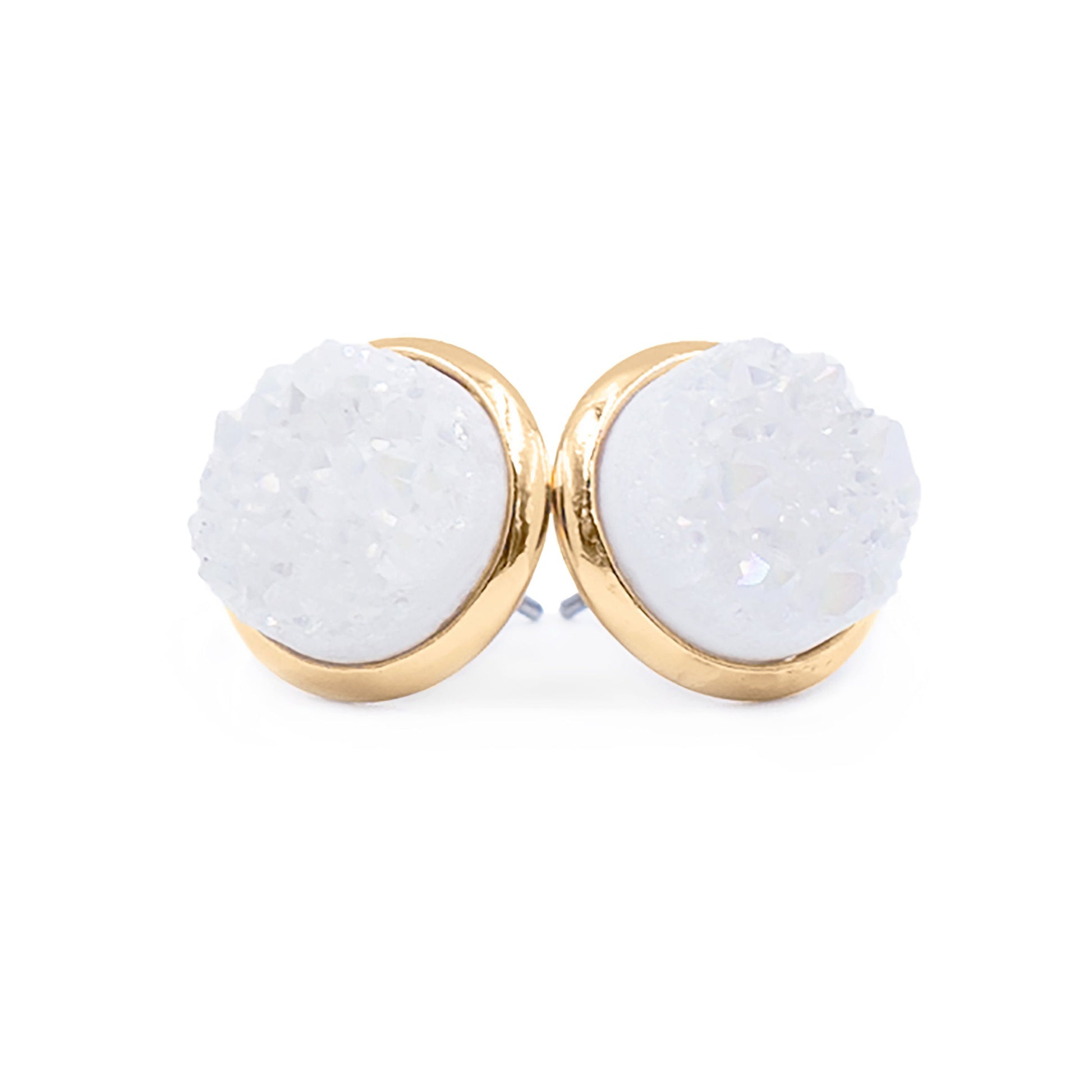 Gold And White Featherweight Hypoallergenic Nickel Free Stud Earrings. Custom Druzy Raw Natural Quartz Stone Accents And Designed With Love In Texas. Size 10mm Diameter With Custom Sizing Available On Select Pieces.