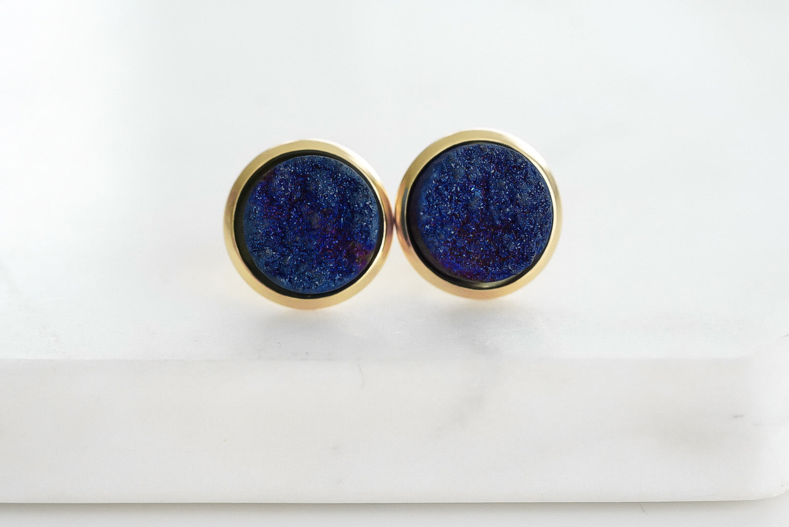 Gold And Purple Featherweight Hypoallergenic Nickel Free Stud Earrings. Custom Druzy Raw Natural Quartz Stone Accents And Designed With Love In Texas. Size 10mm Diameter With Custom Sizing Available On Select Pieces.
