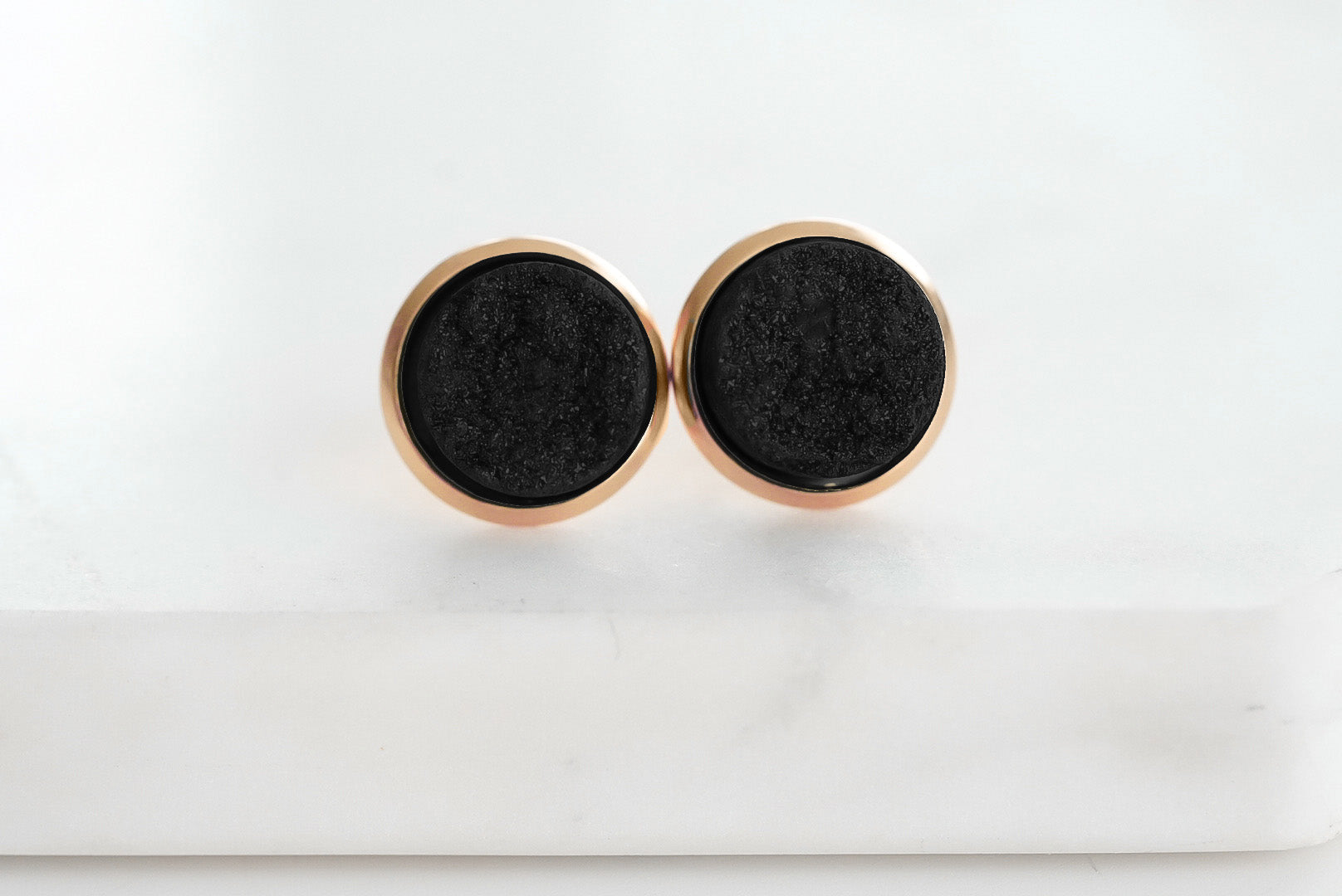 Rose Gold And Black Featherweight Hypoallergenic Nickel Free Stud Earrings. Custom Druzy Raw Natural Quartz Stone Accents And Designed With Love In Texas. Size 10mm Diameter With Custom Sizing Available On Select Pieces.