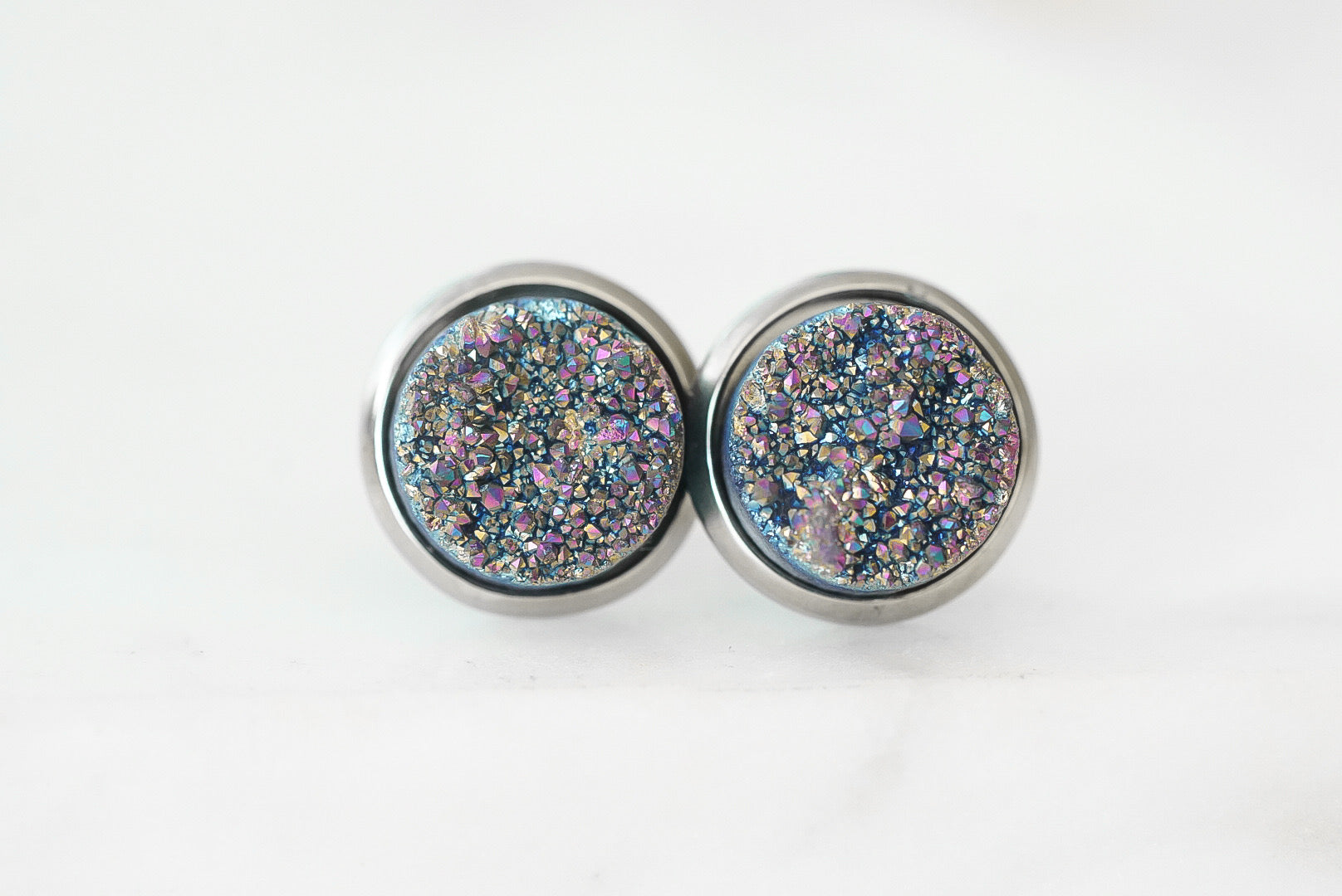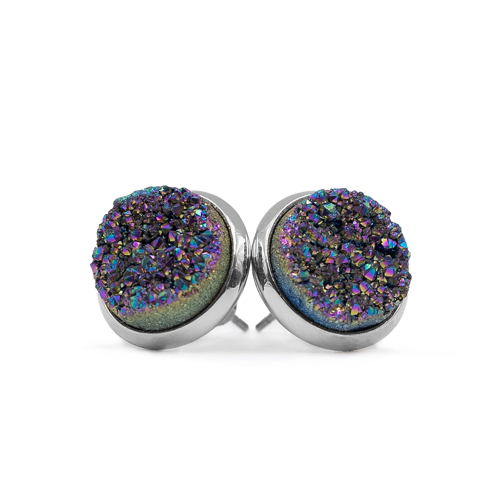 Silver And Purple Featherweight Hypoallergenic Nickel Free Stud Earrings. Custom Druzy Raw Natural Quartz Stone Accents And Designed With Love In Texas. Size 10mm Diameter With Custom Sizing Available On Select Pieces.