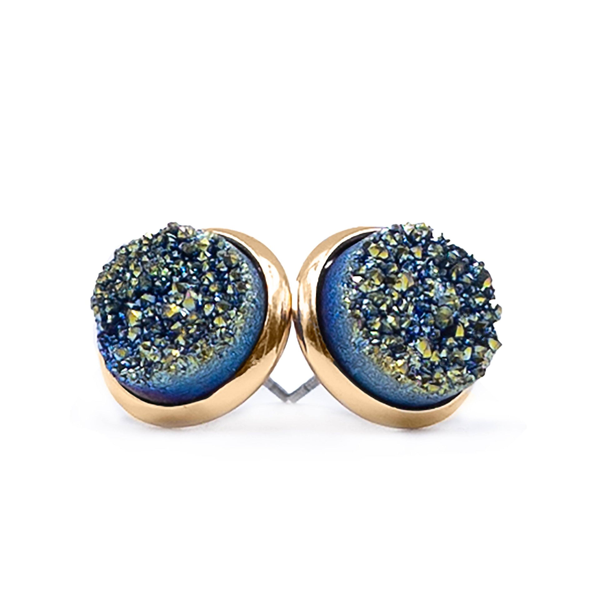 Gold And Green Featherweight Hypoallergenic Nickel Free Stud Earrings. Custom Druzy Raw Natural Quartz Stone Accents And Designed With Love In Texas. Size 10mm Diameter With Custom Sizing Available On Select Pieces.
